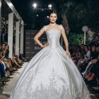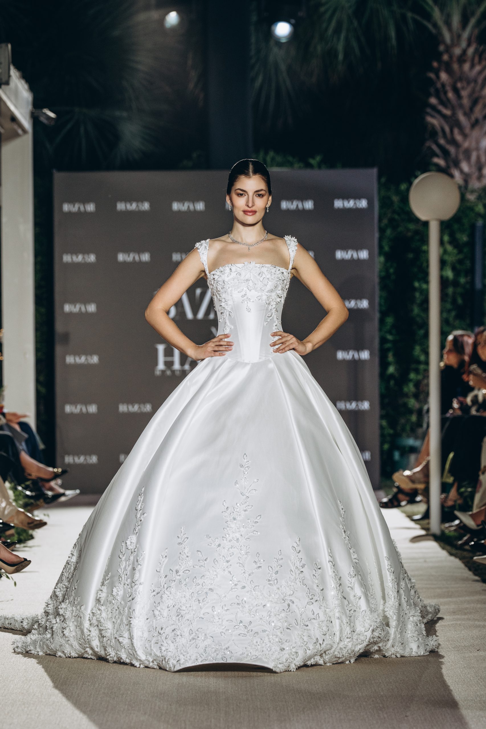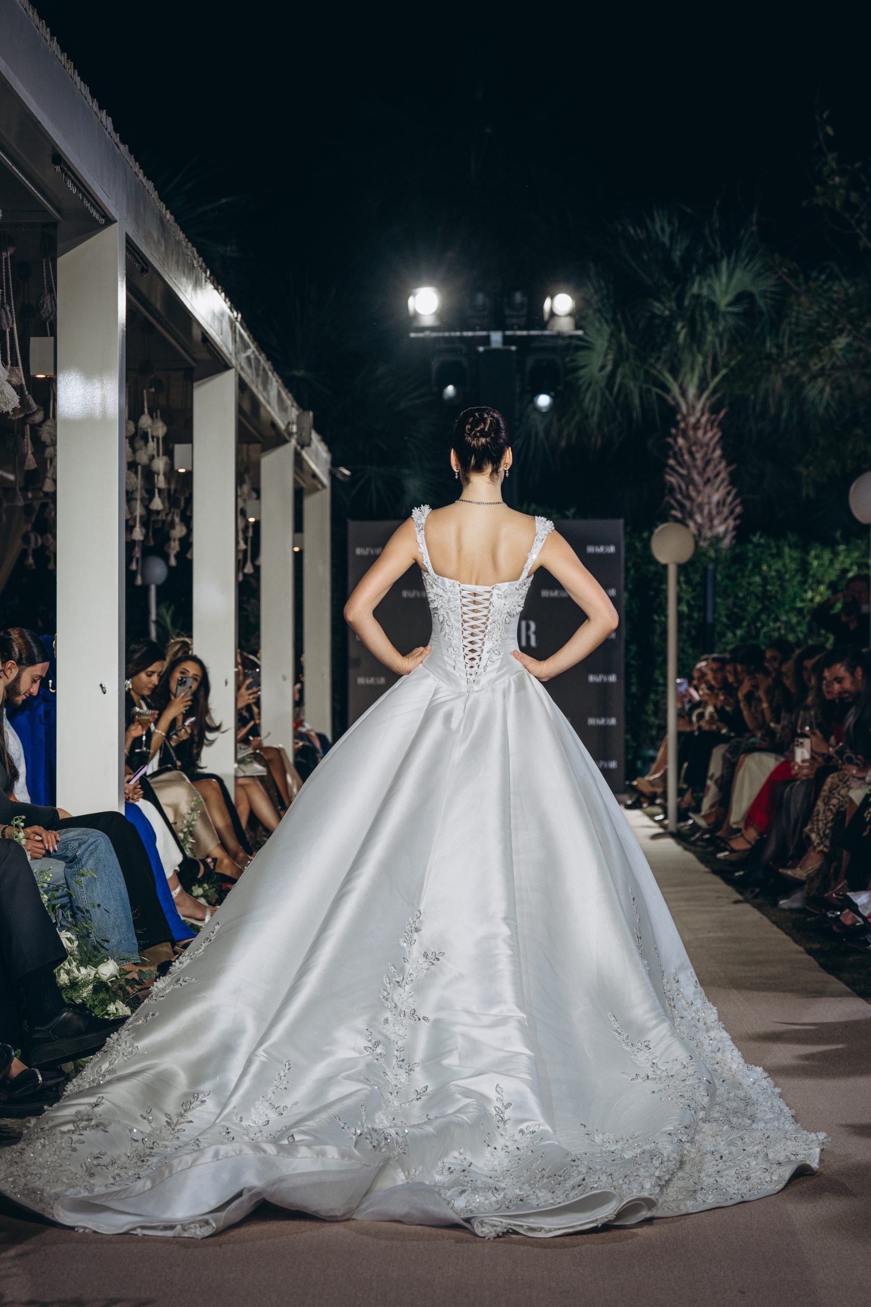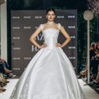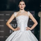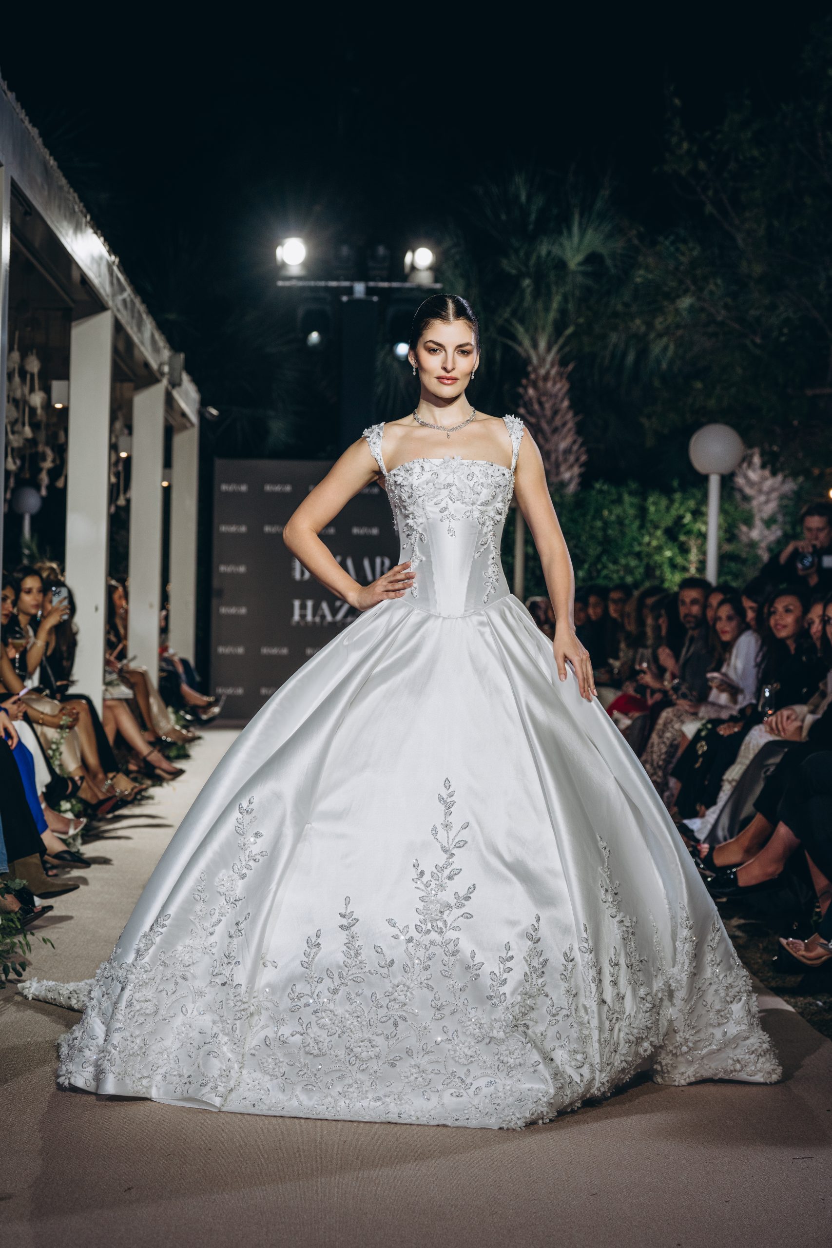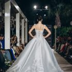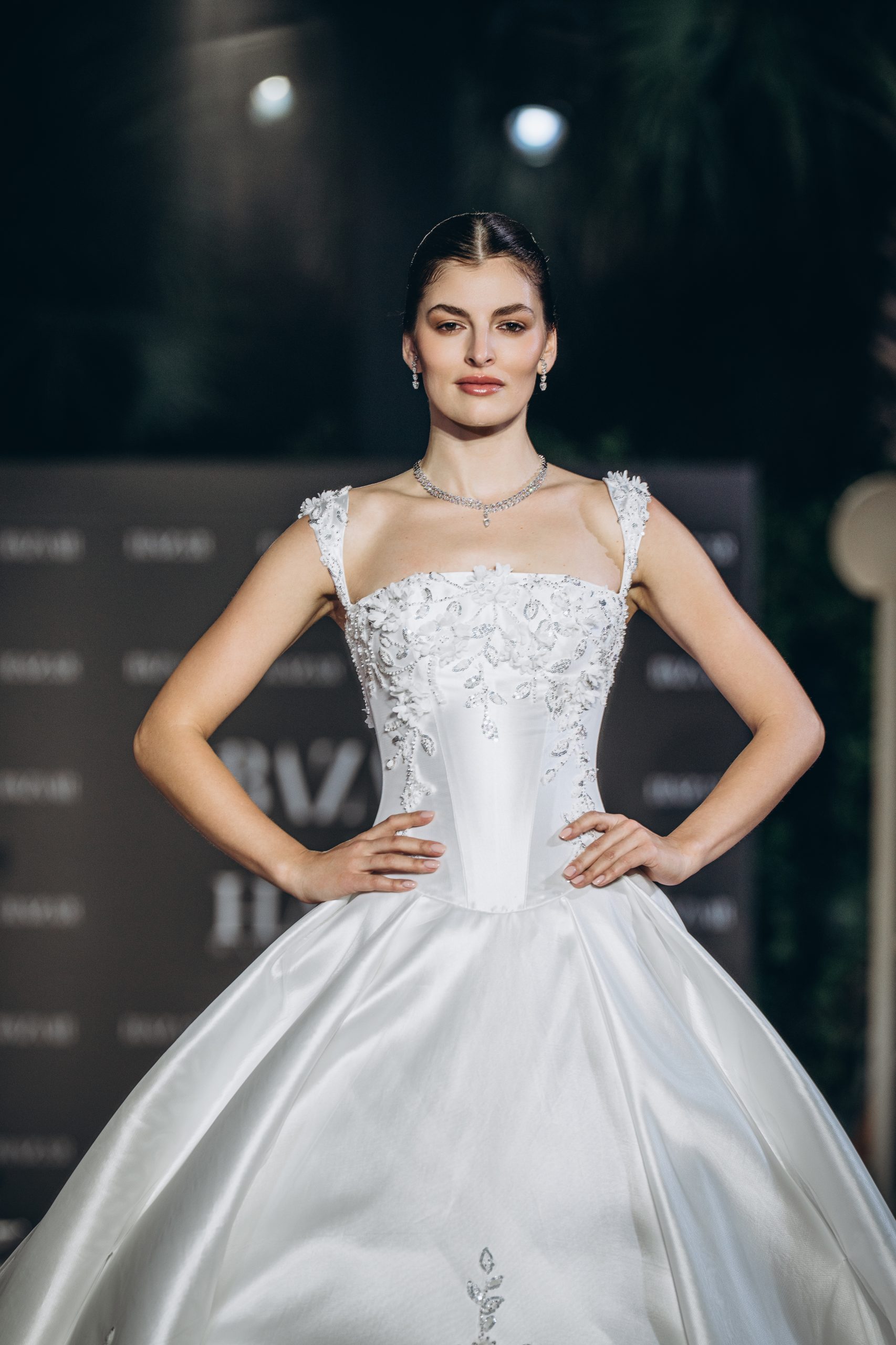 Lace is placed with intention, tracing the torso before the silhouette expands into a paneled mikado skirt. The form widens with measured precision, allowing volume to emerge without excess. Every curve is drawn, not softened.