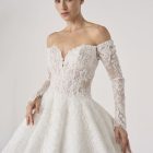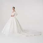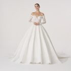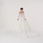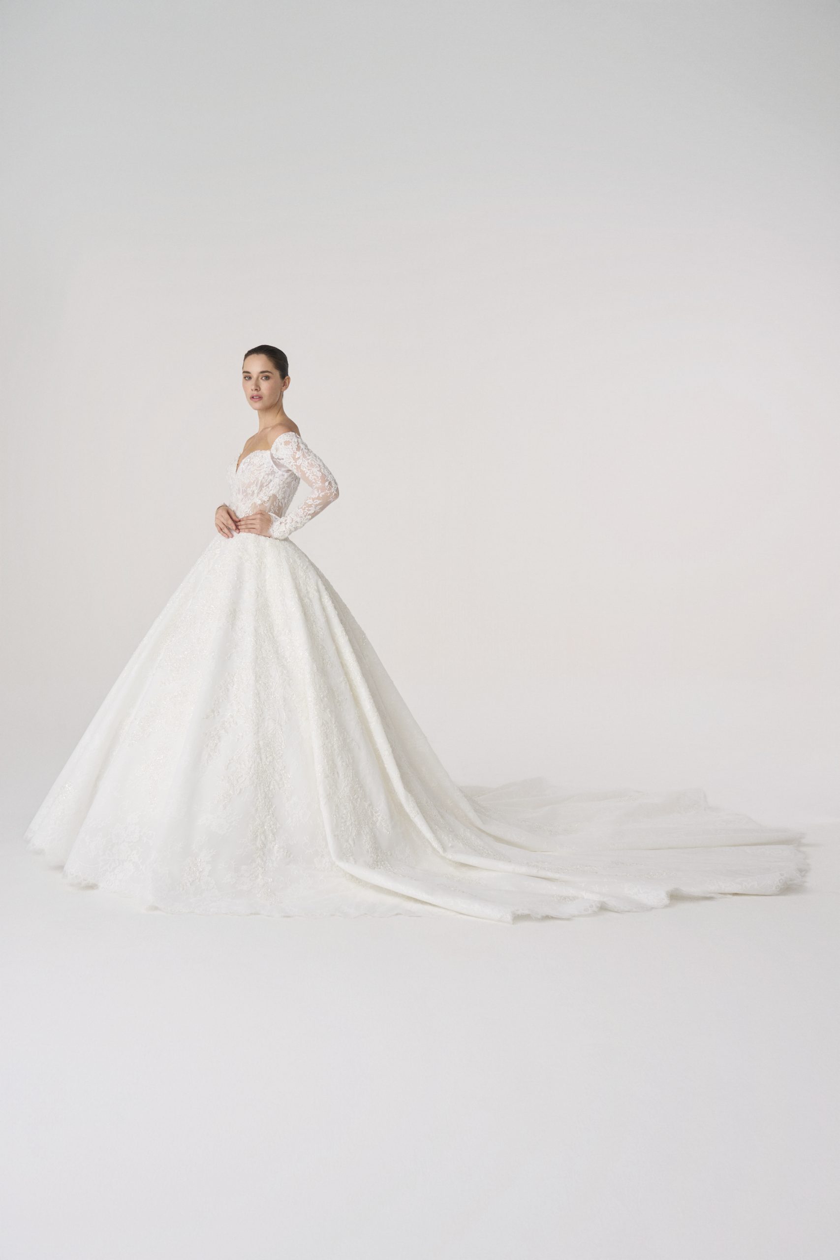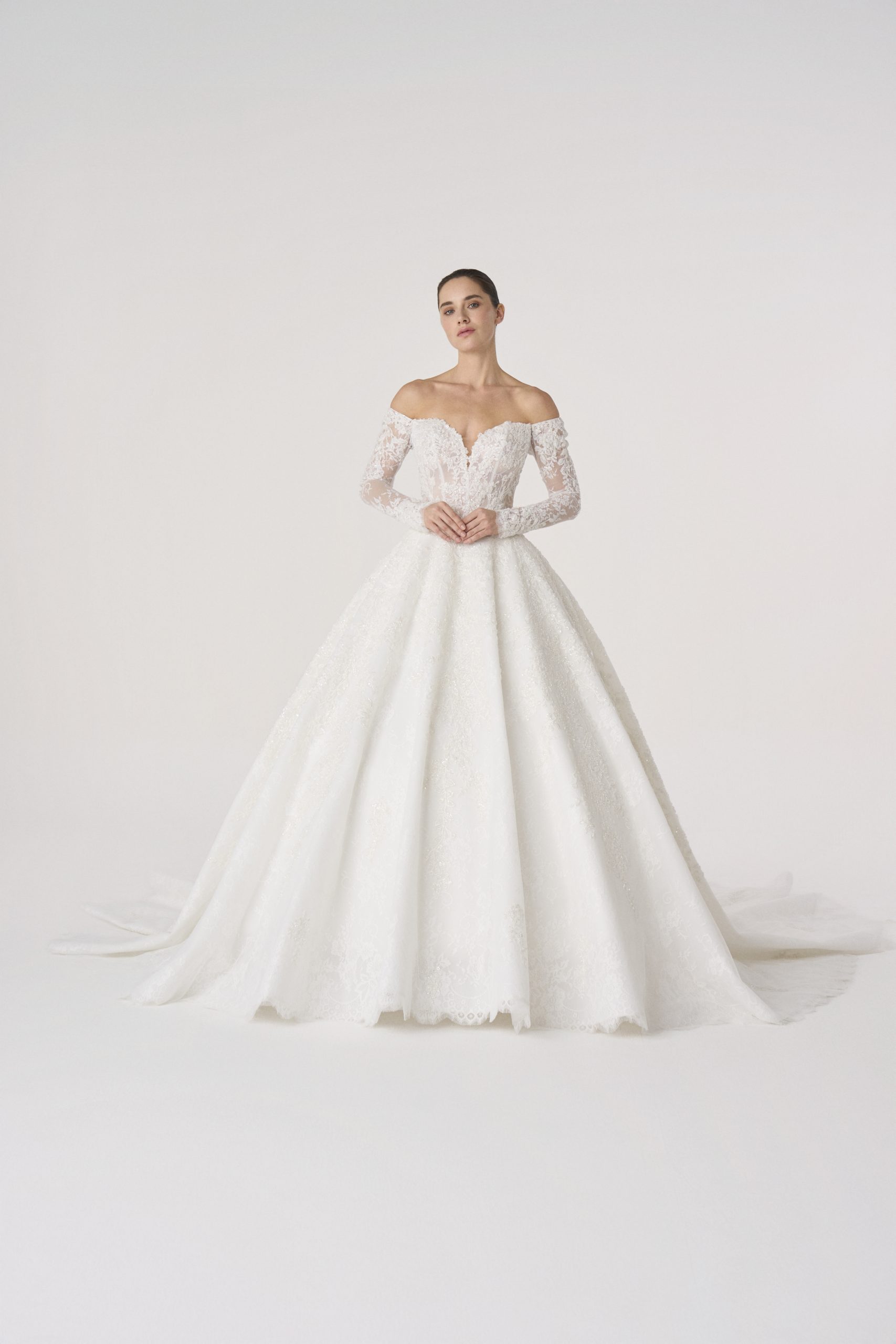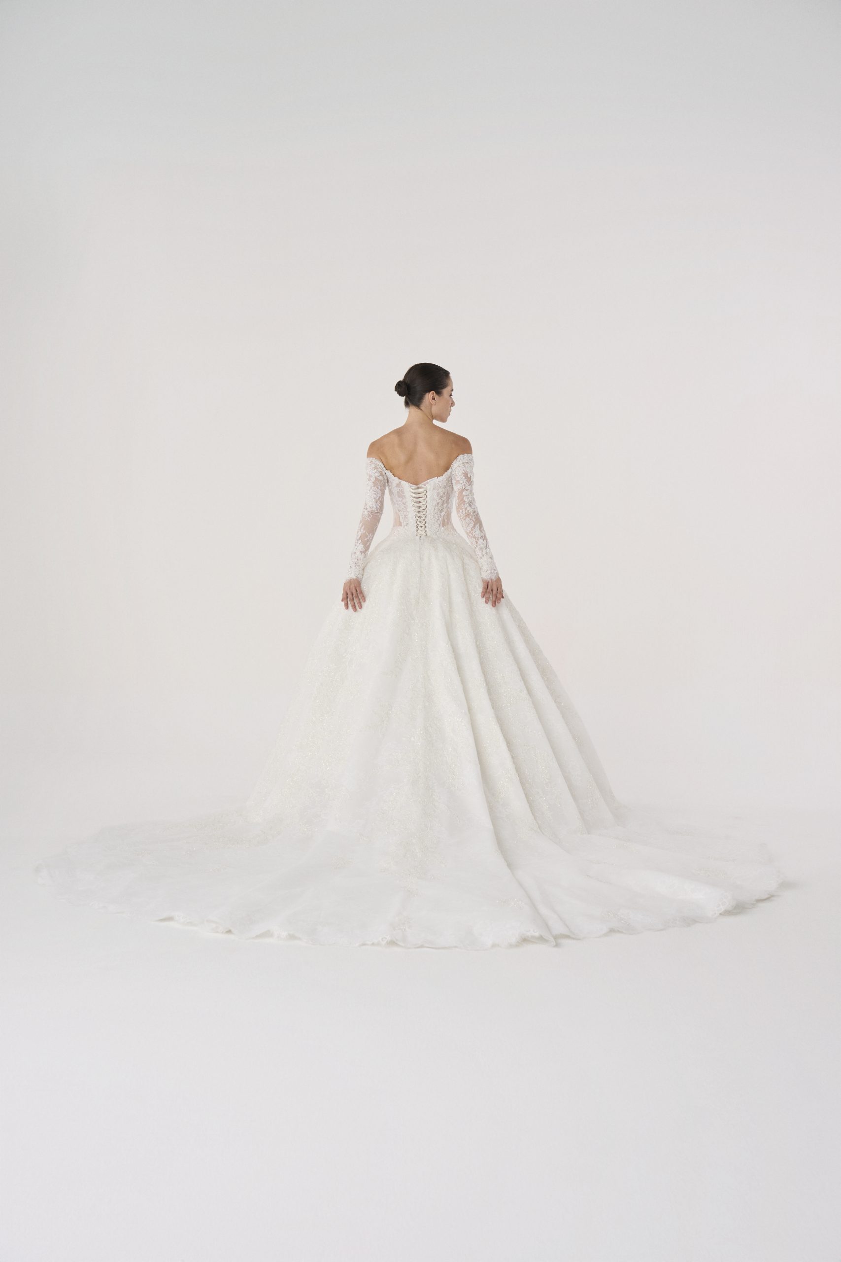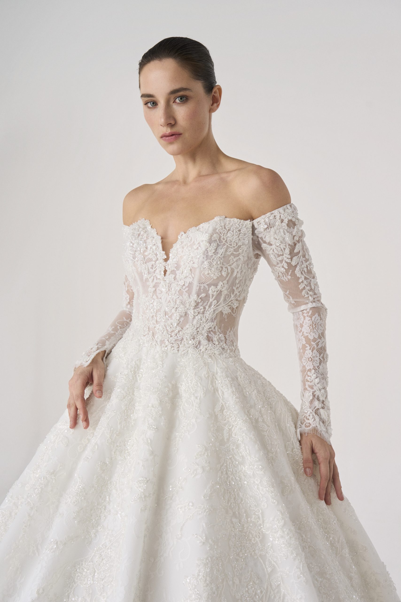 Named after Elysium, the mythic realm of eternal beauty and peace, this gown embodies a vision of paradise. With its sculpted lace bodice, off-the-shoulder neckline, and flowing skirt, it feels both celestial and grounded, as though it were woven from light itself.