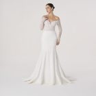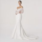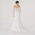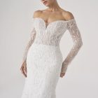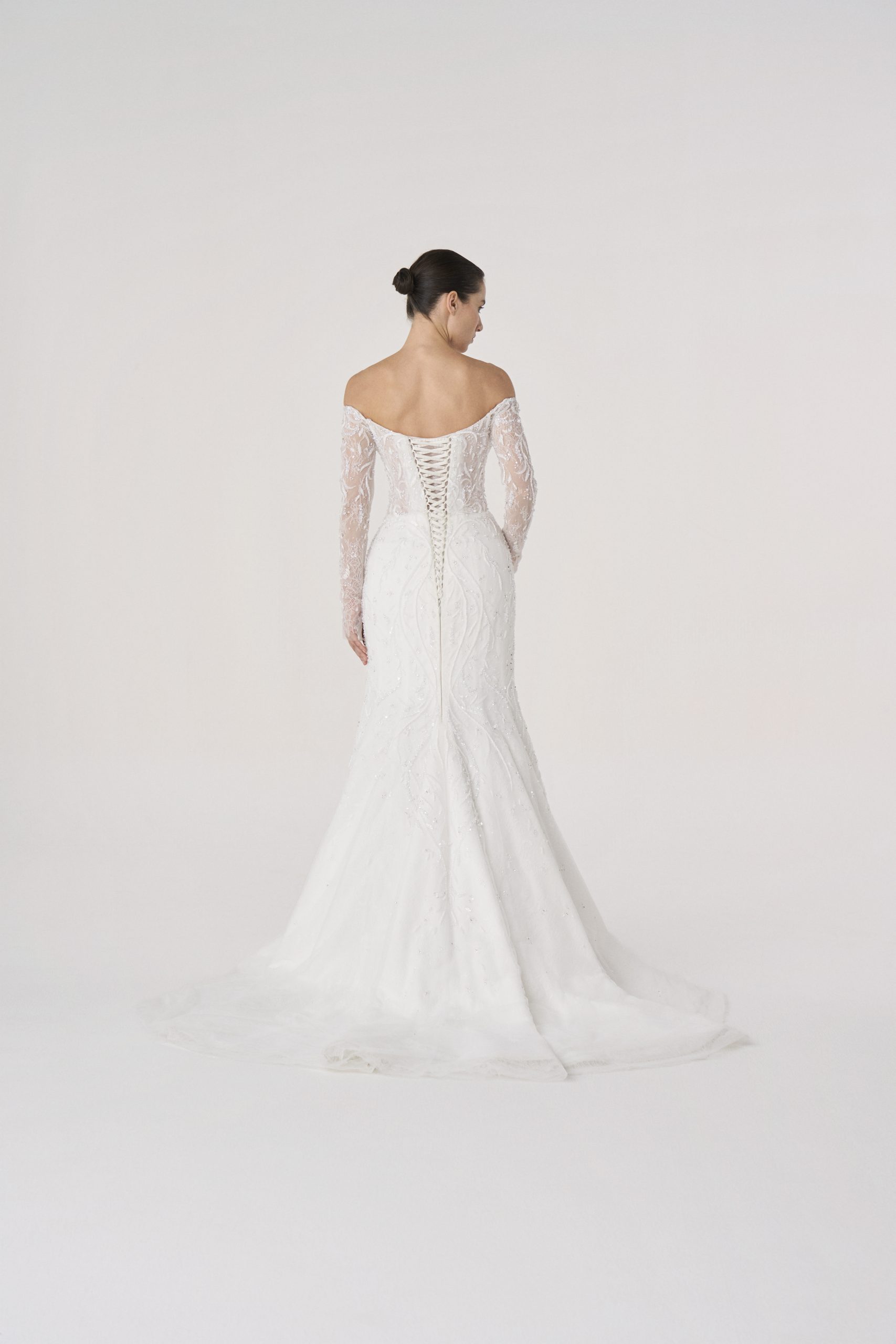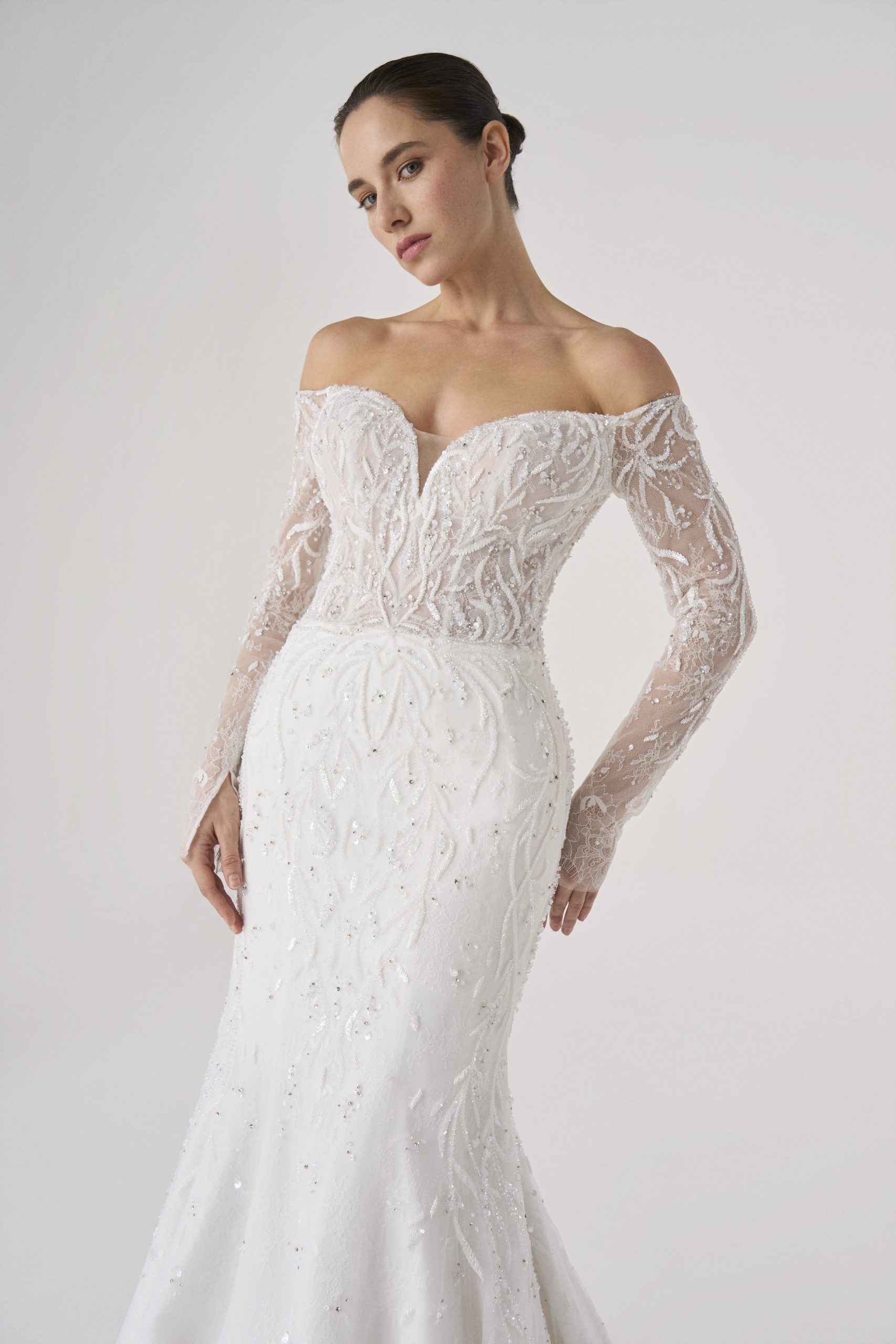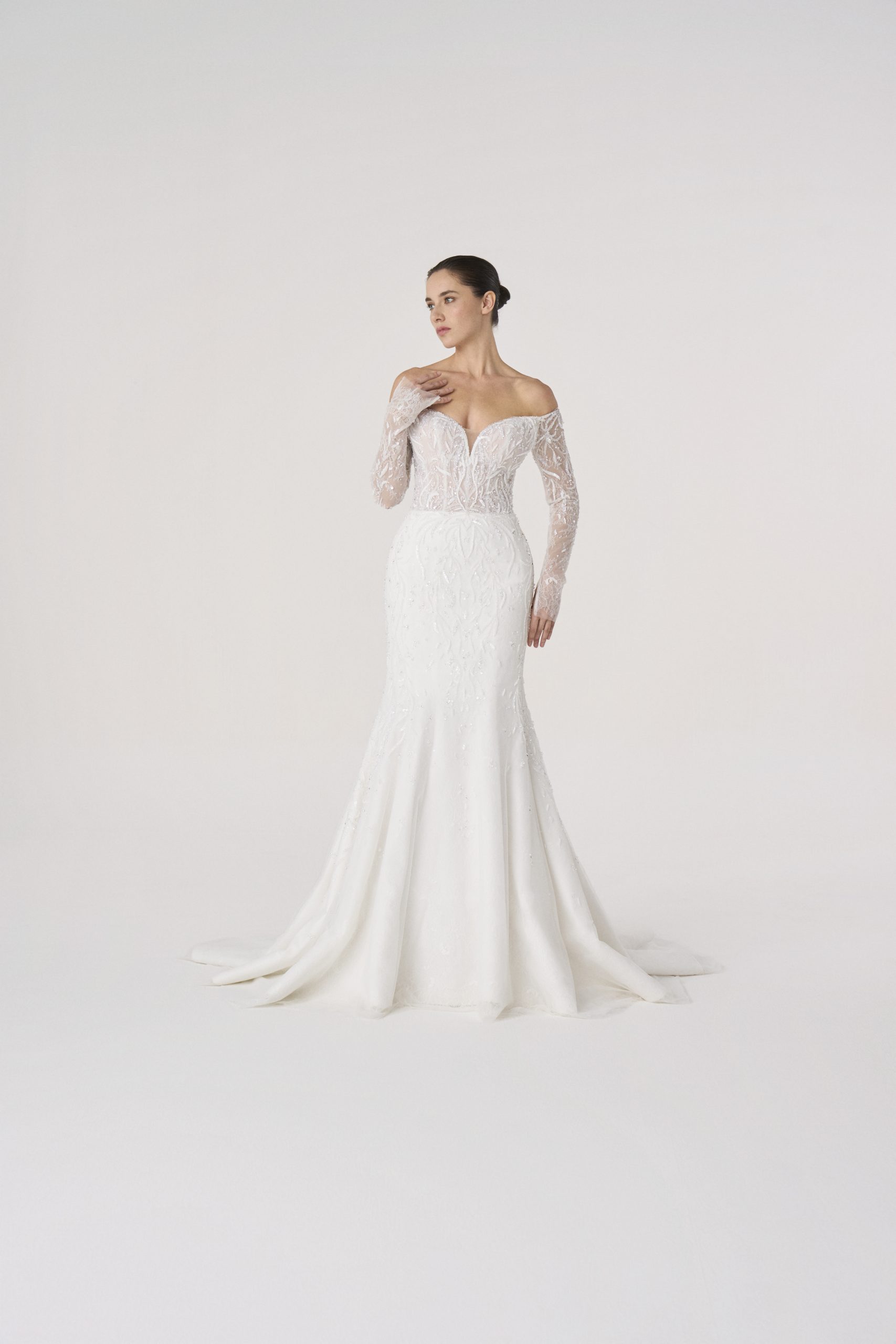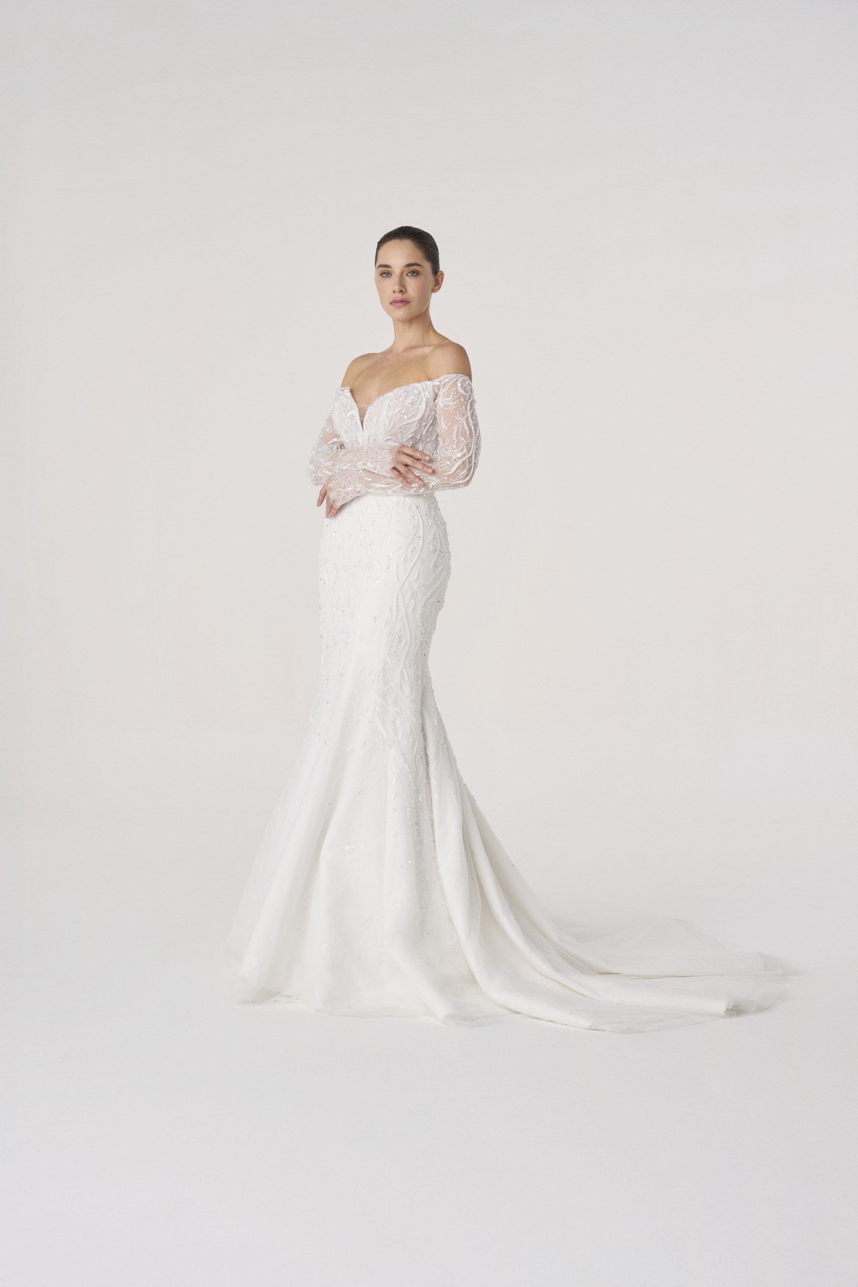 Named after the Latin word for fire, this gown burns with quiet intensity. The sculpted silhouette hugs the figure like molten flame, while the off-shoulder neckline and sheer embroidered sleeves evoke both delicacy and power.