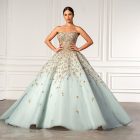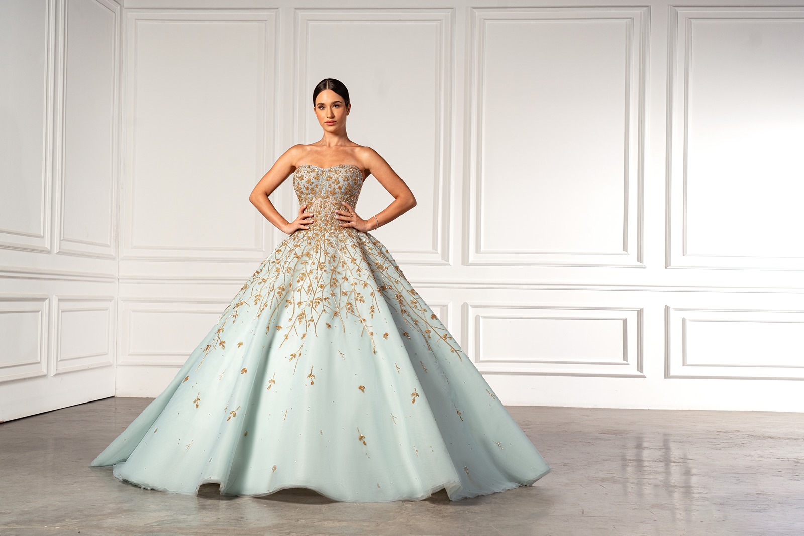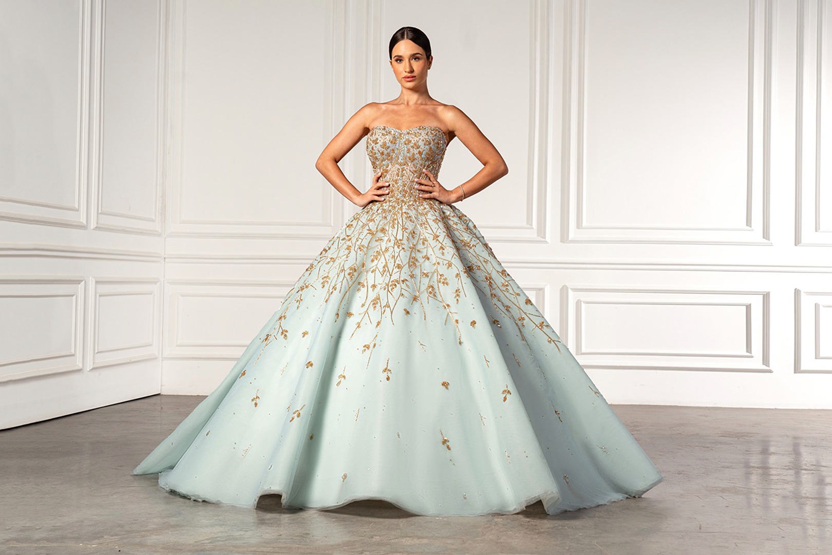 The Enchanted Dream. A Strapless Tiffany Ball gown embroidered with golden glass beads and Swarovski crystals makes a perfect vision of a grand entrance.