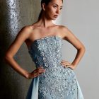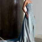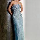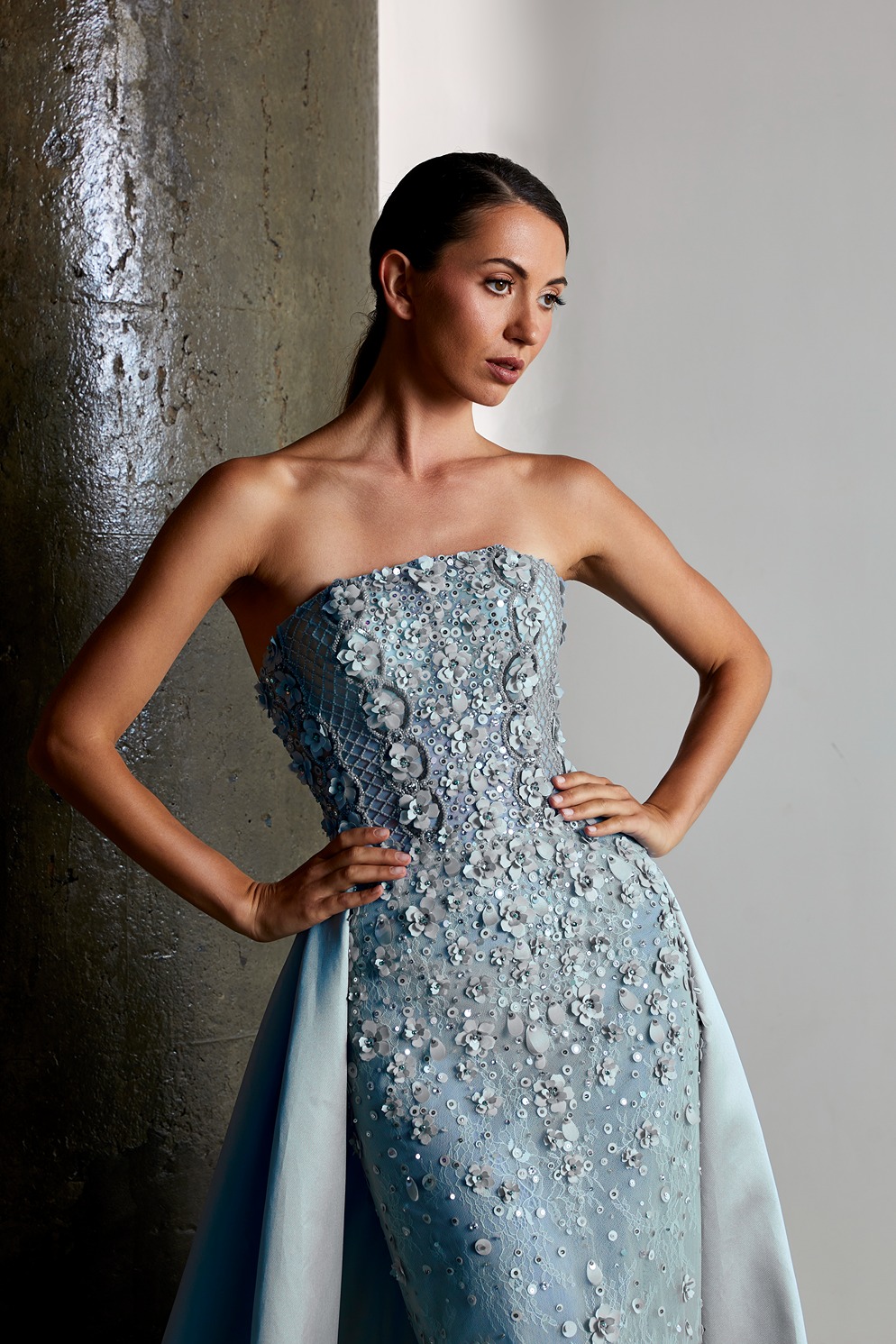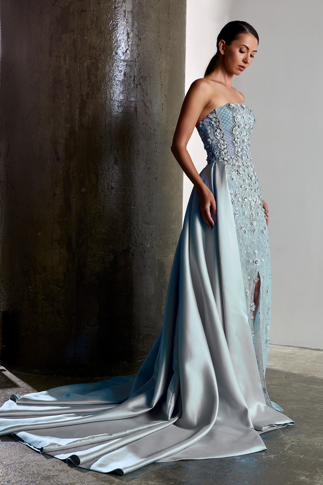 Details: Beaded Strapless Serpentine Dress with Mikado over skirt