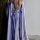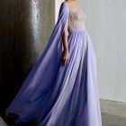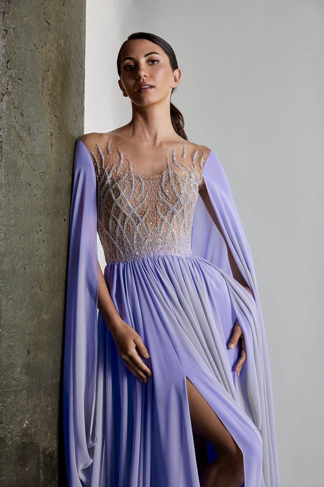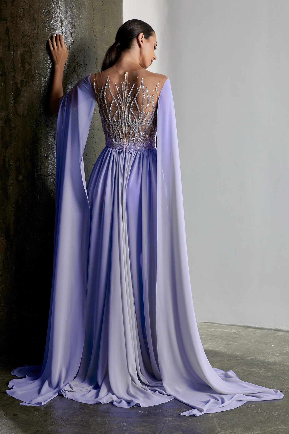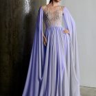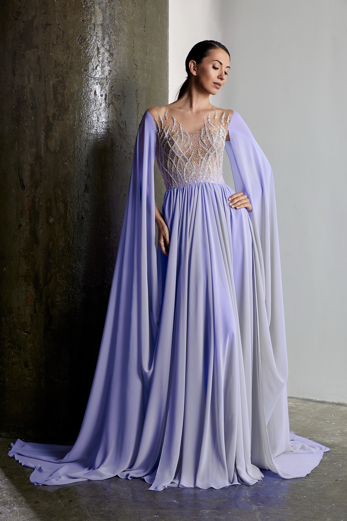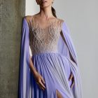 Details: Beaded Illusion Bodice Silk Chiffon Long Dress with Cape Sleeves