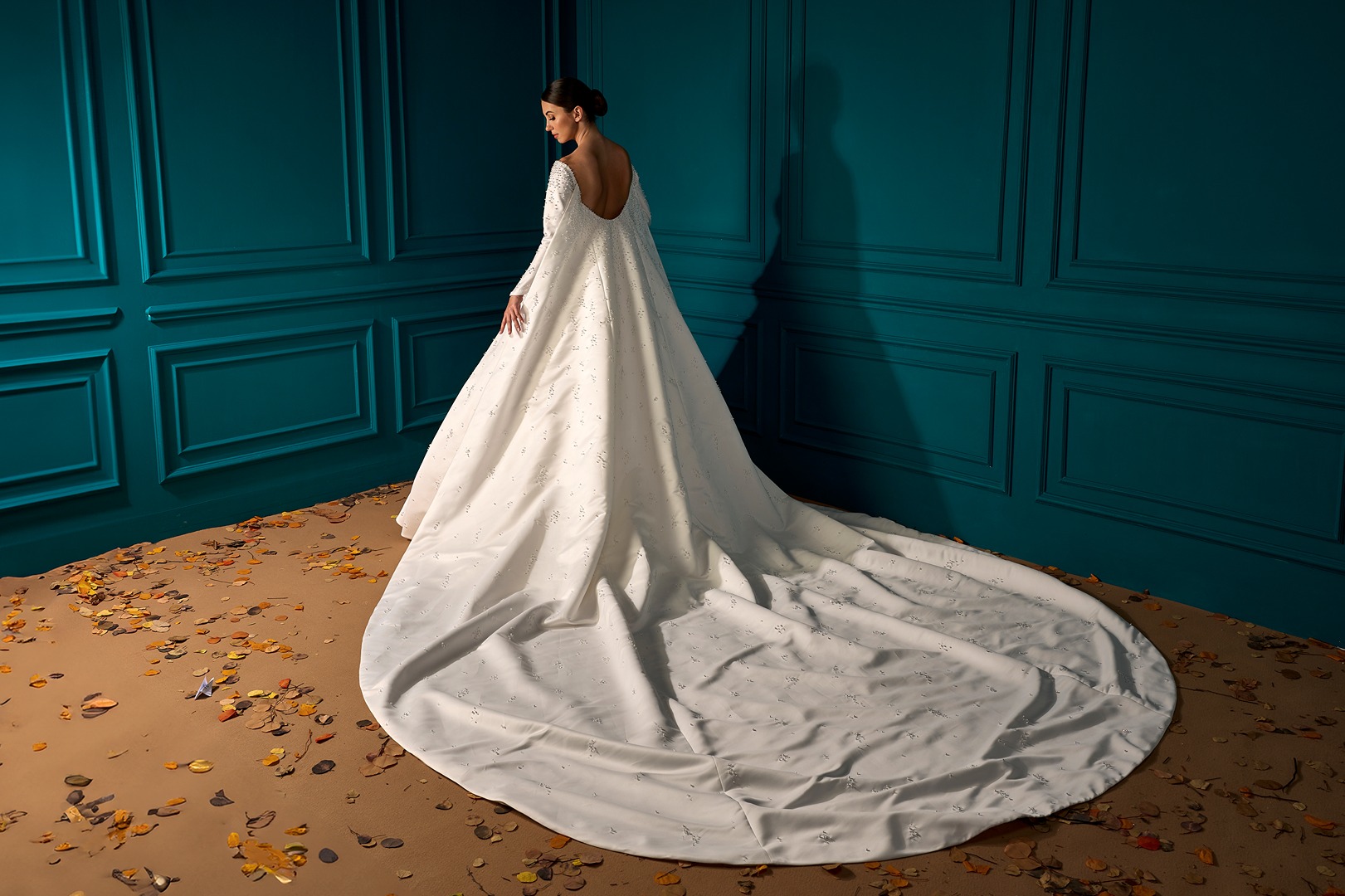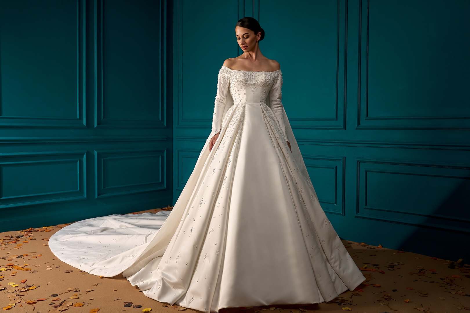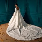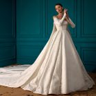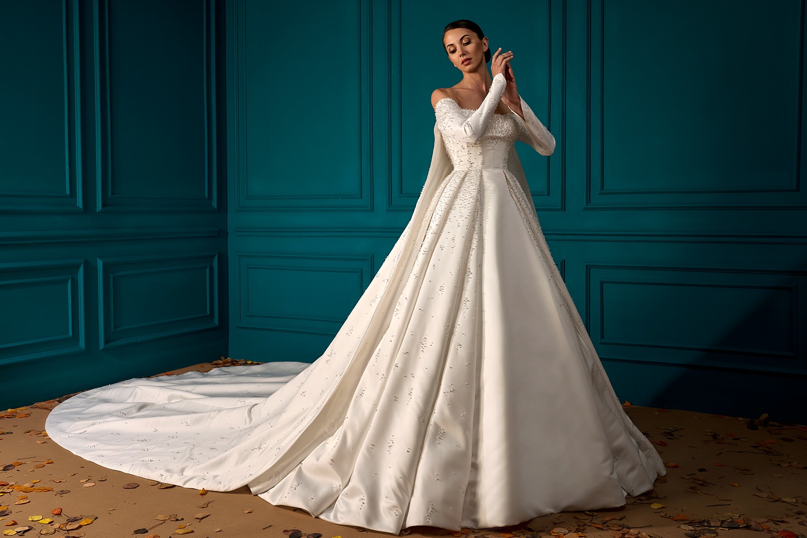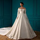Details: Off Shoulder Pleated A-Line Satin Dress with Detachable Cape.