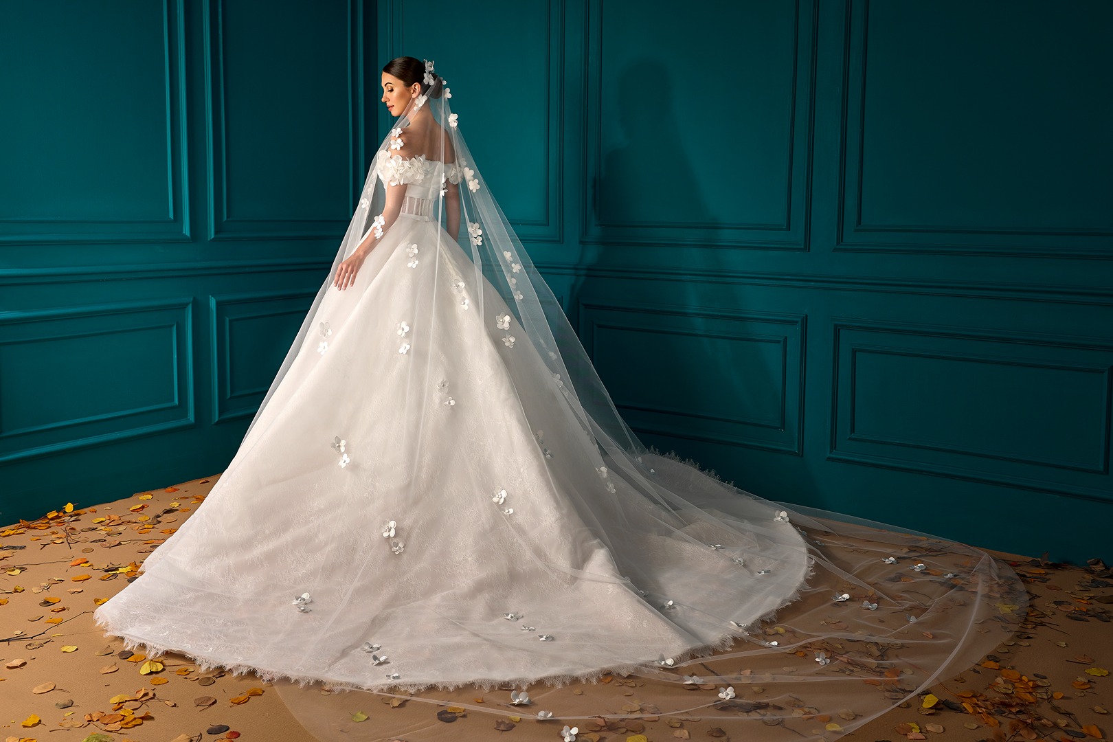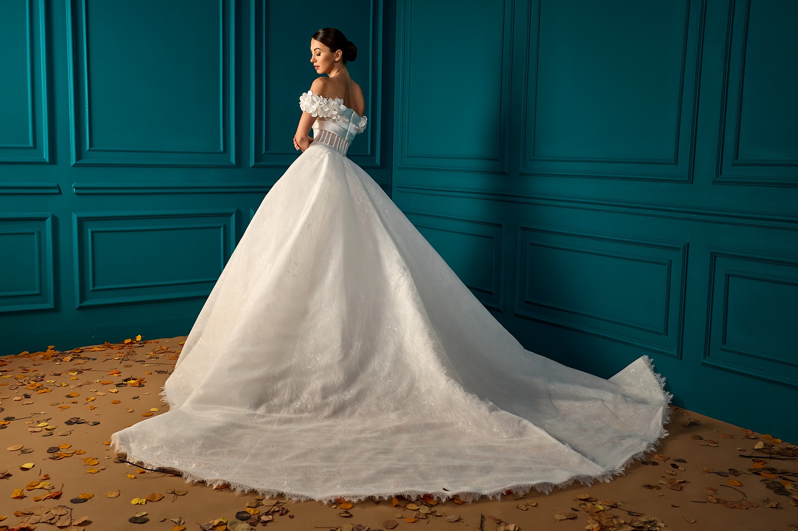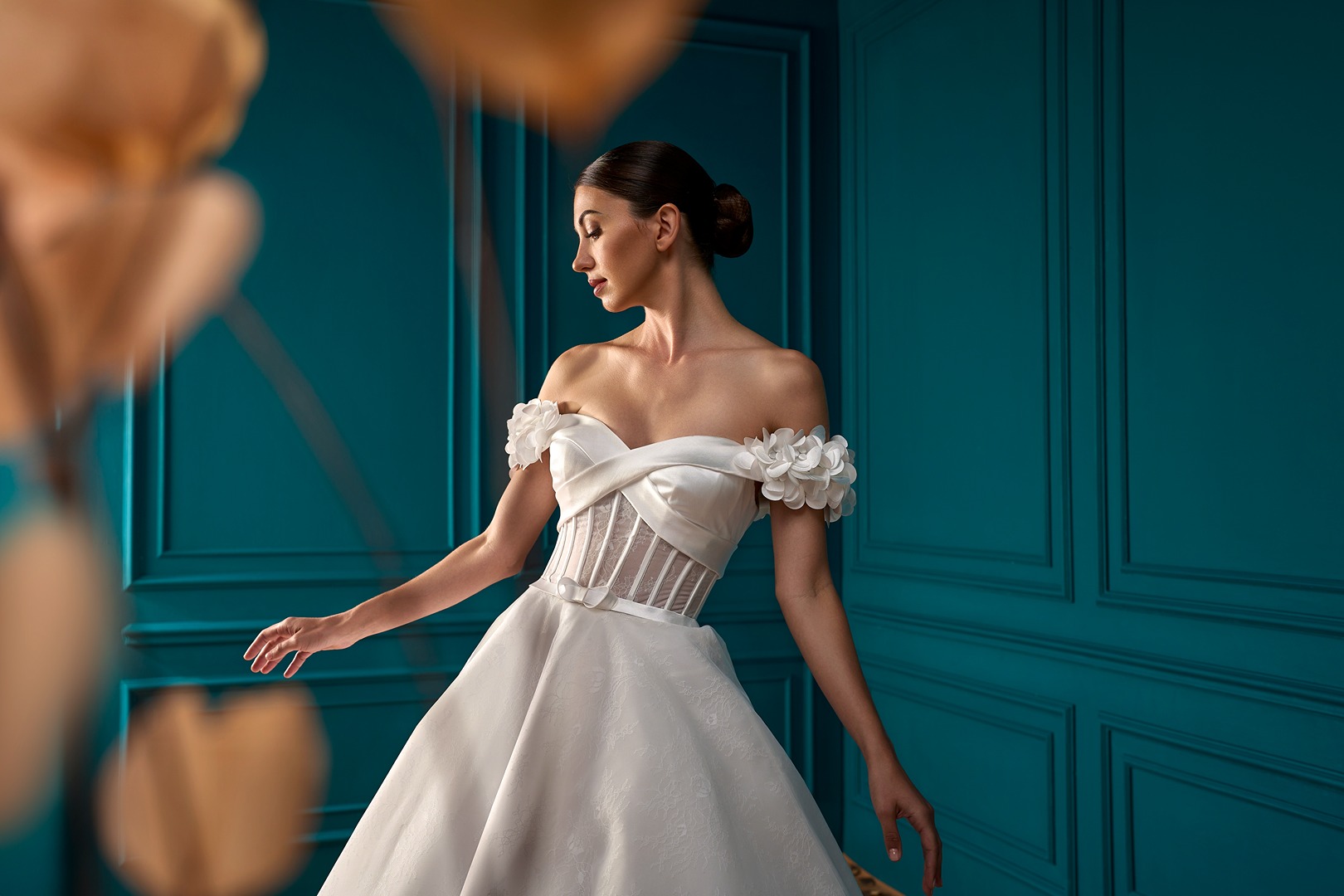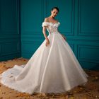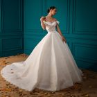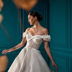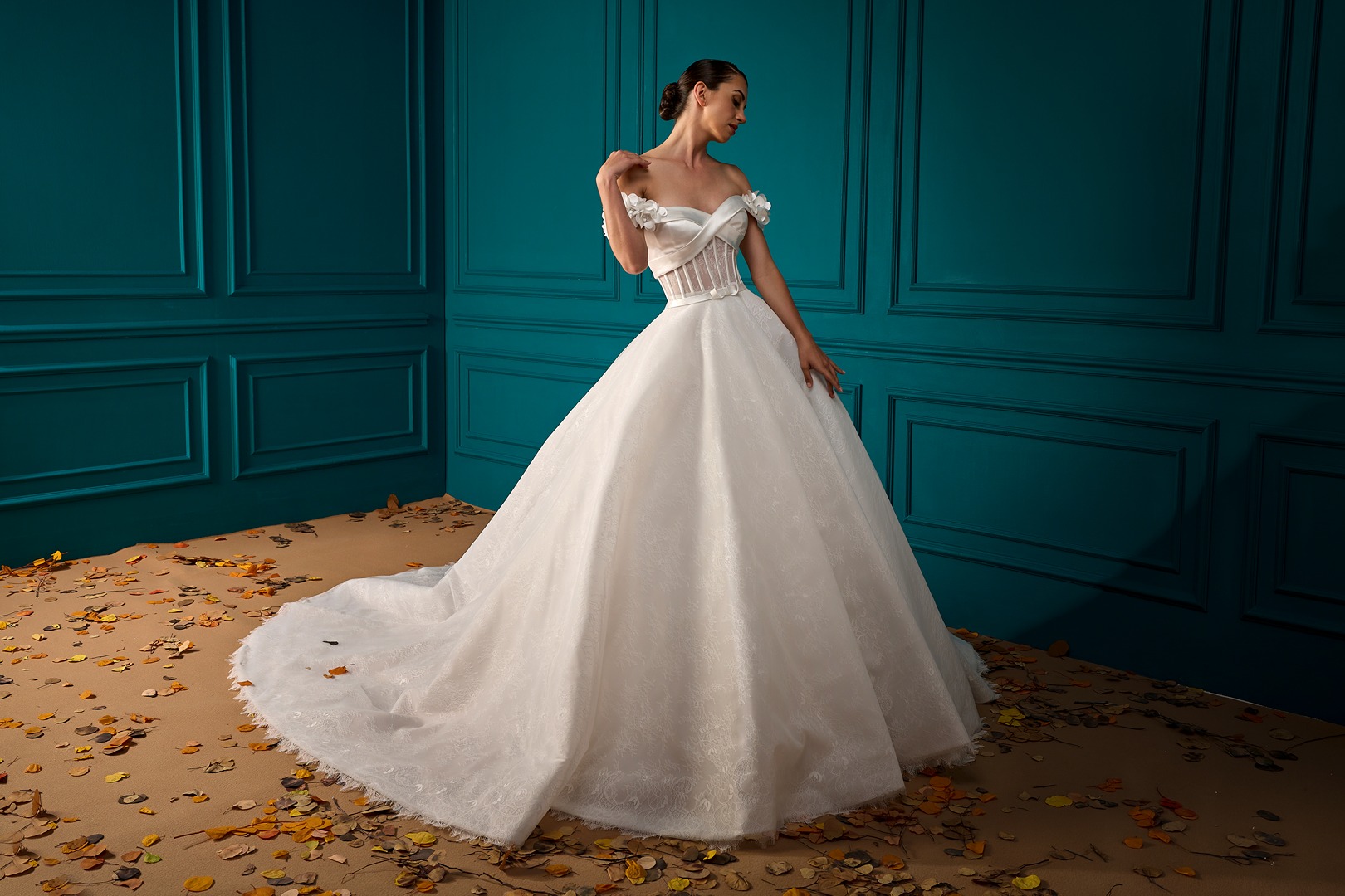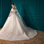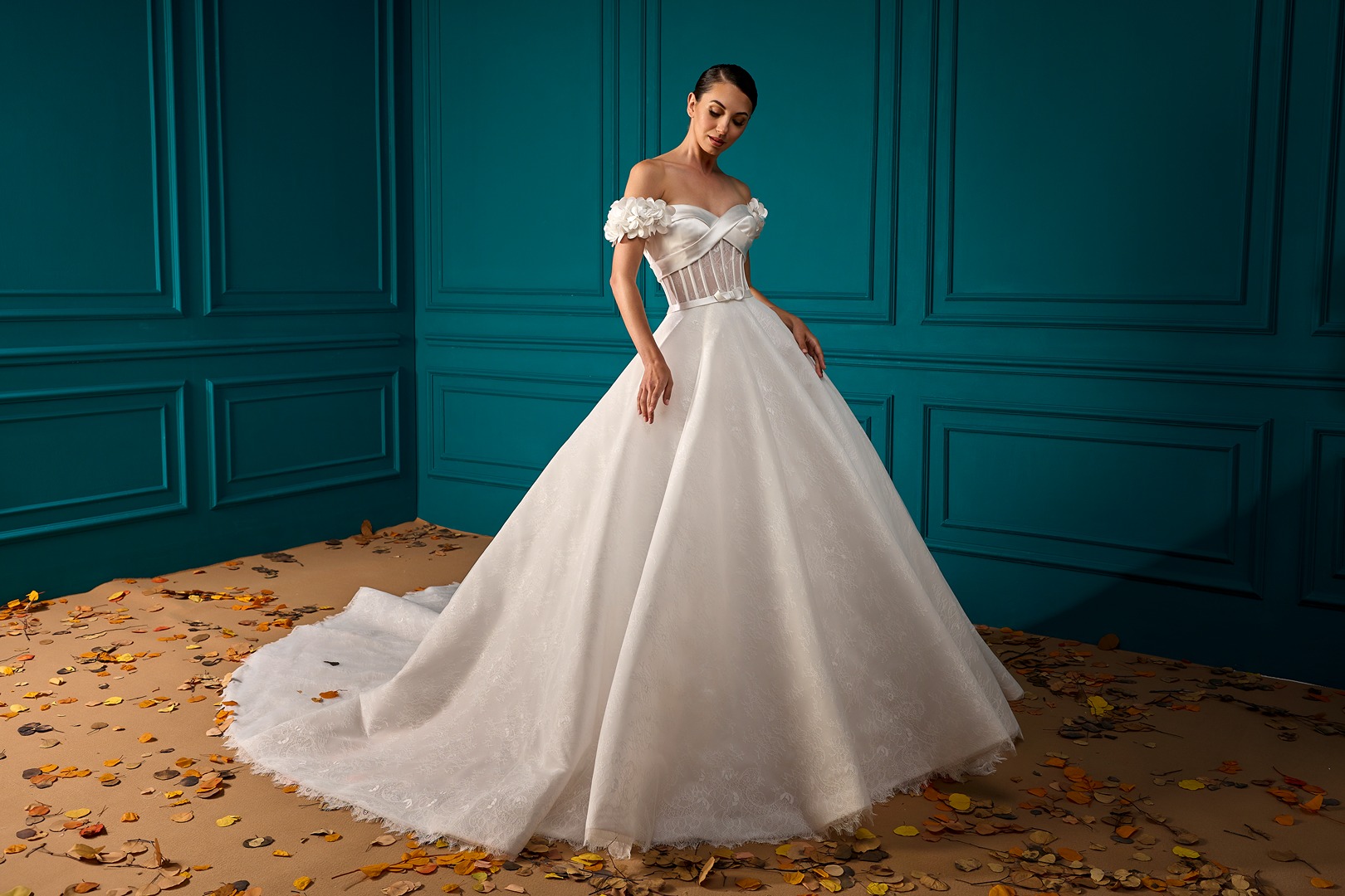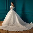 Style: A-Line Details: Lace A-Line dress with Draped Mikado Bodice and Mikado Flower sleeves details.