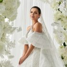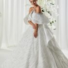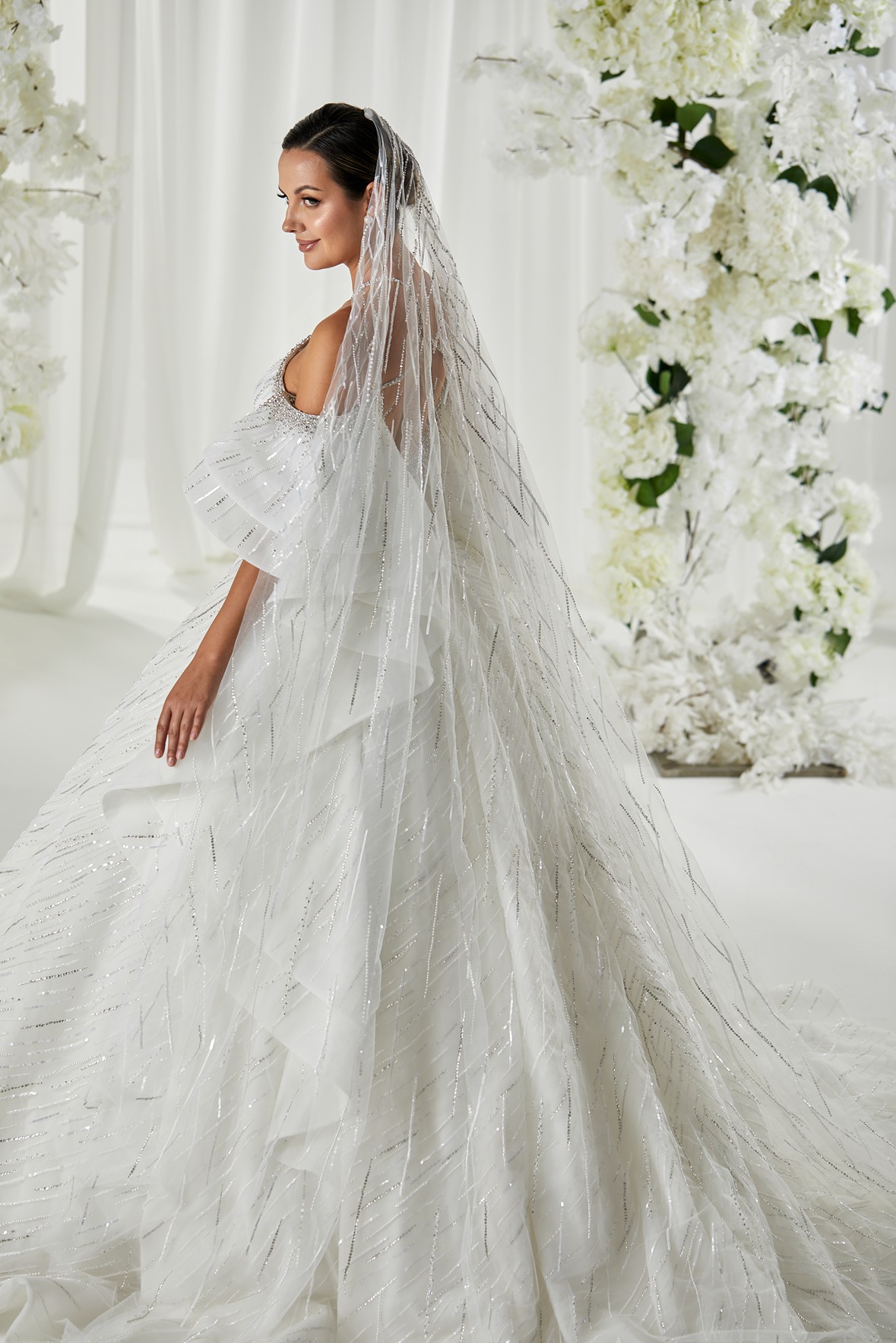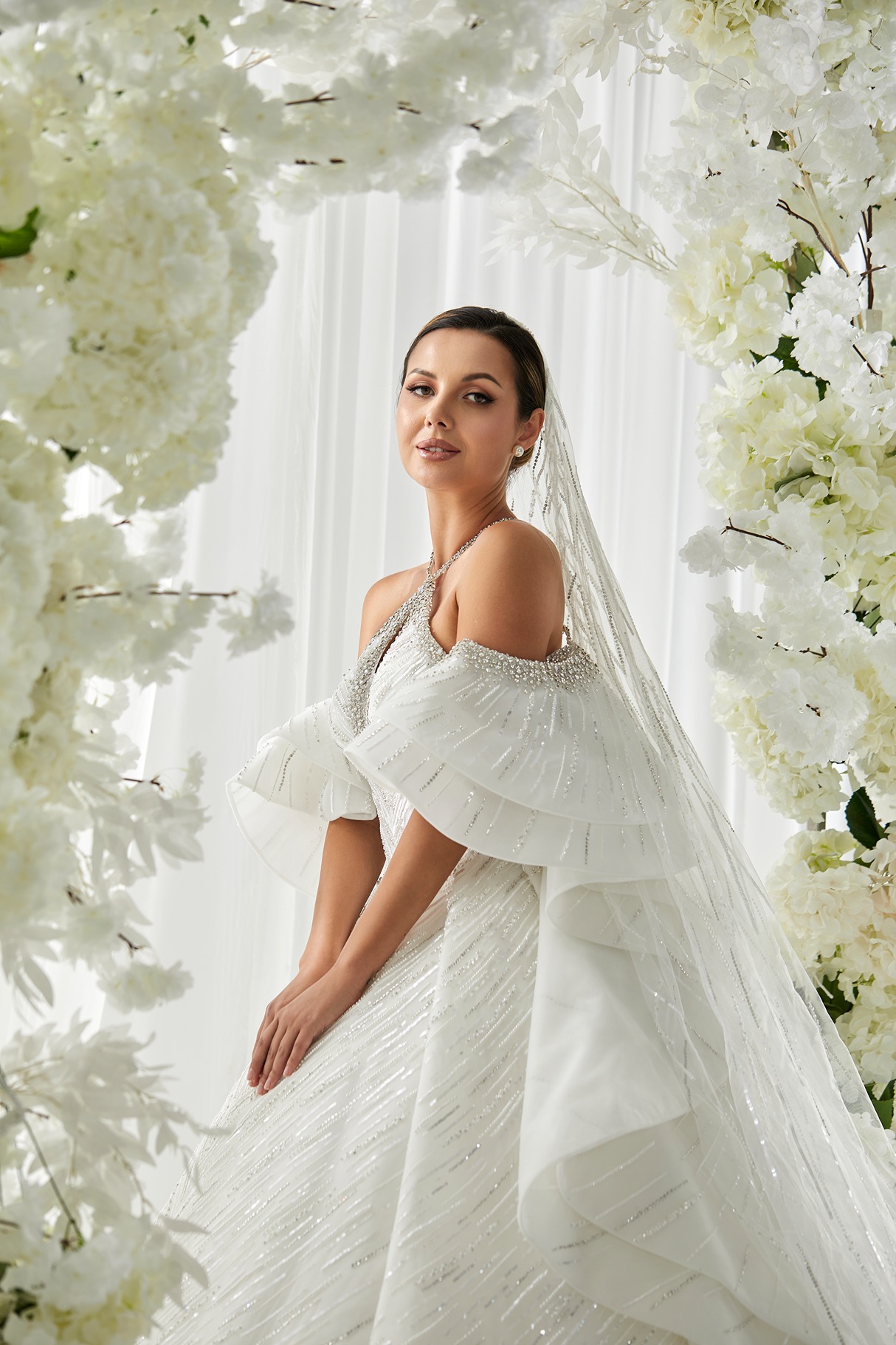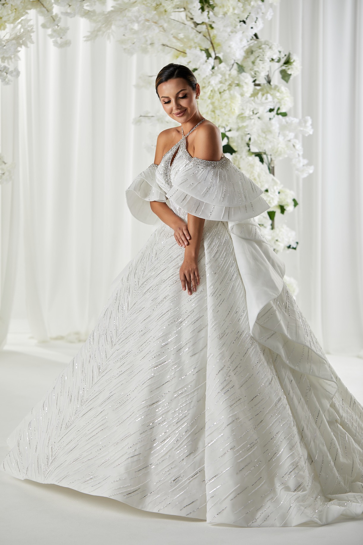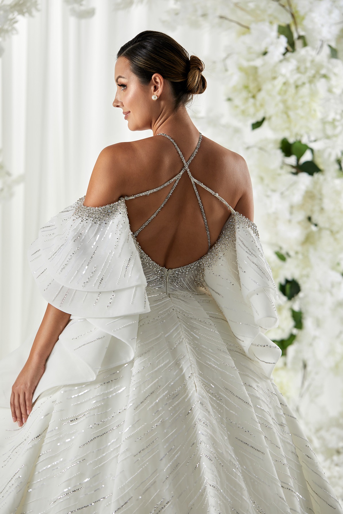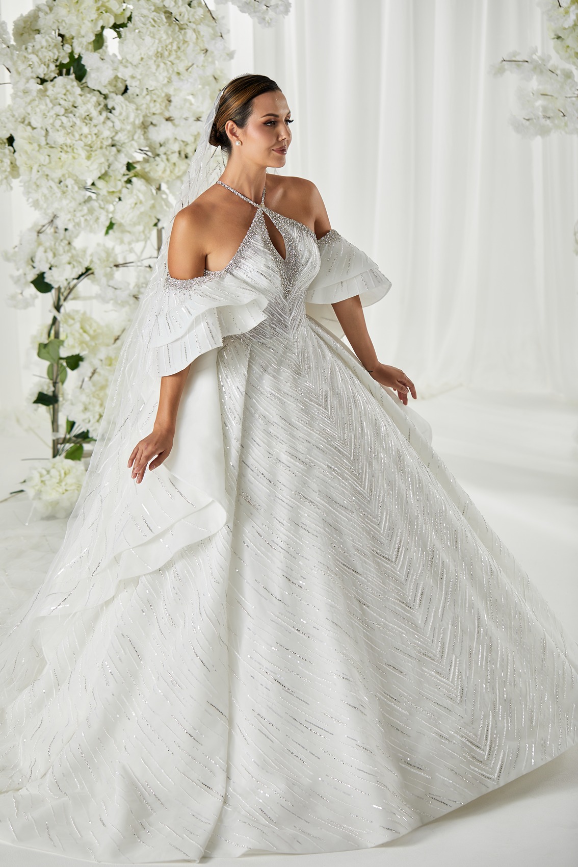 Details: Cerystallized Halter Top Ball Gown with Ruffled sleeves