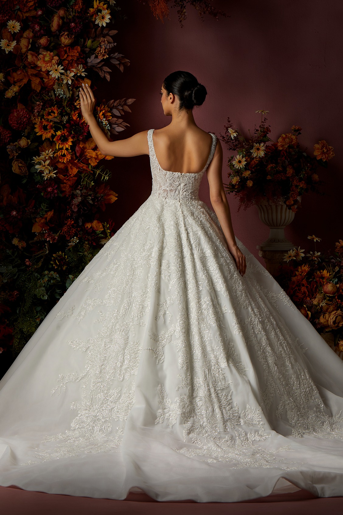 Details: Sleeveless Square neckline ball gown with embroidered thread details and beads.