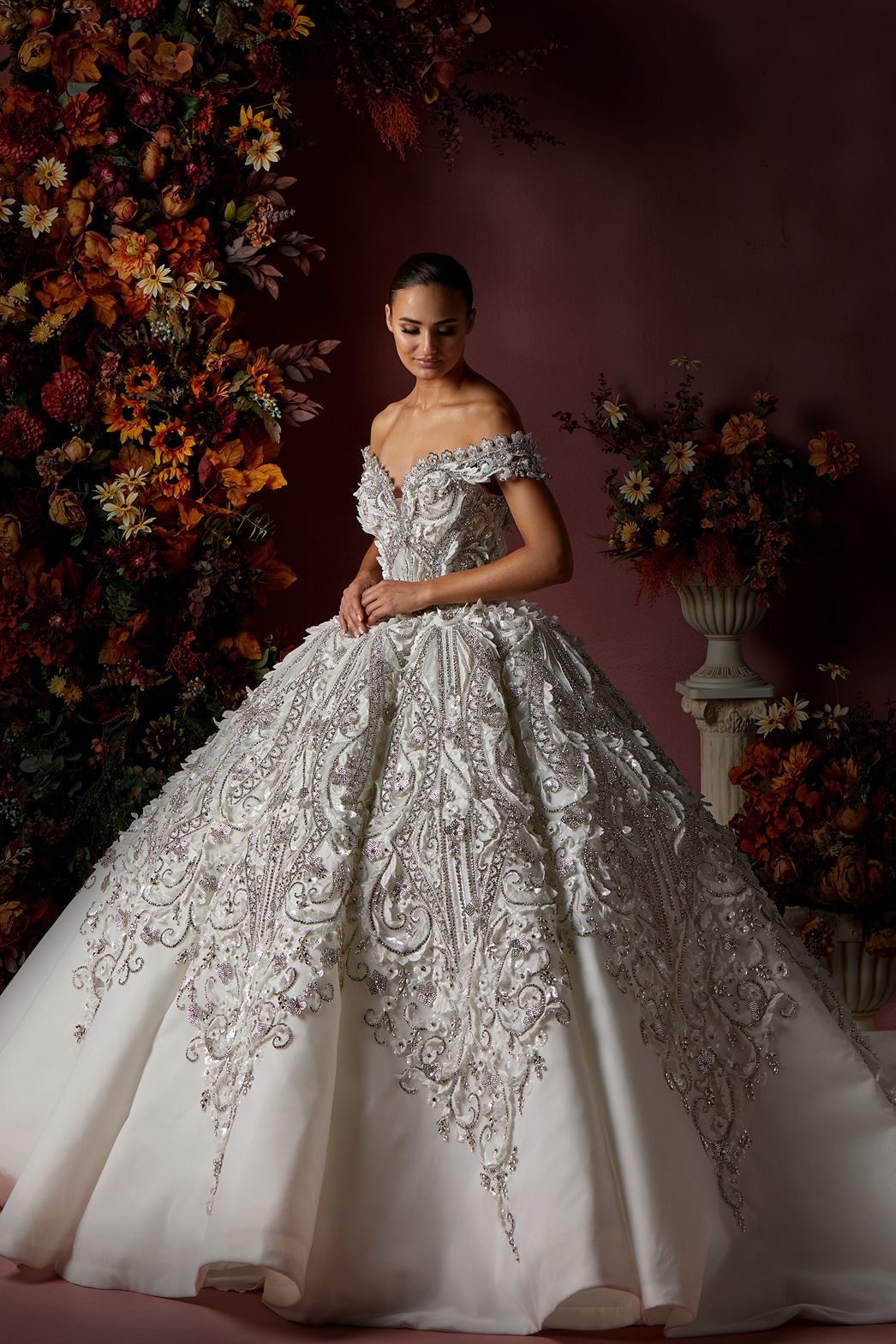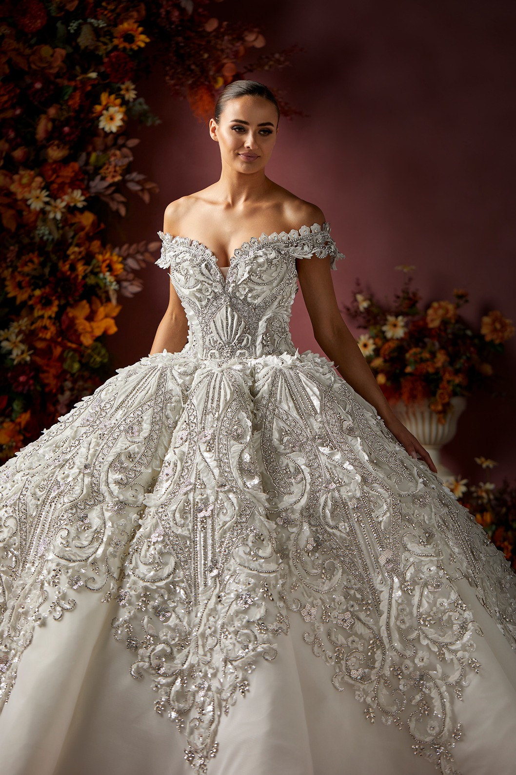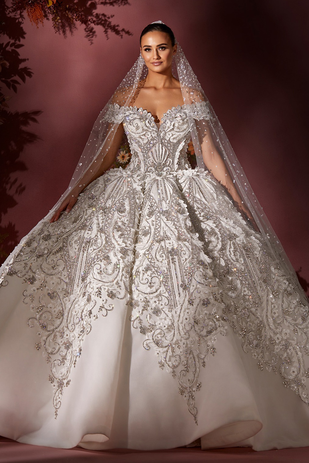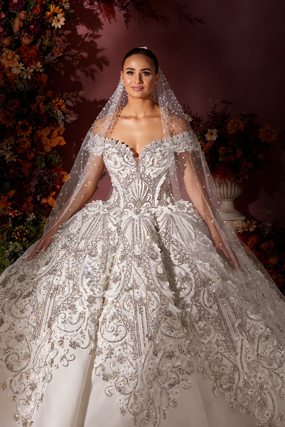 Style: Ball gown Category: Wedding dress Details: Off Shoulder Panel Ball gown encrusted with Swarovski crystals.