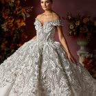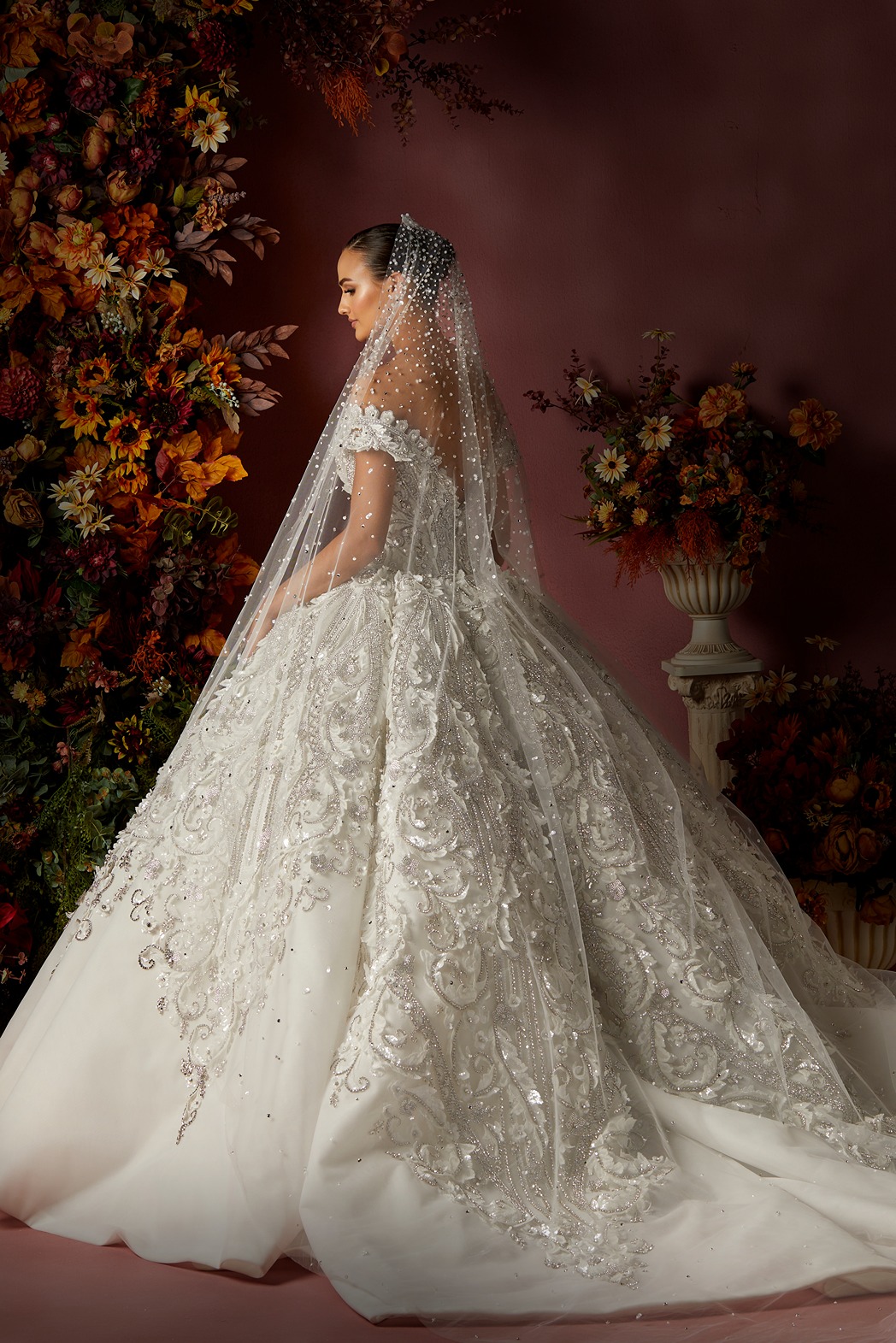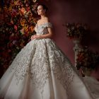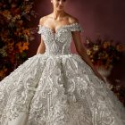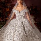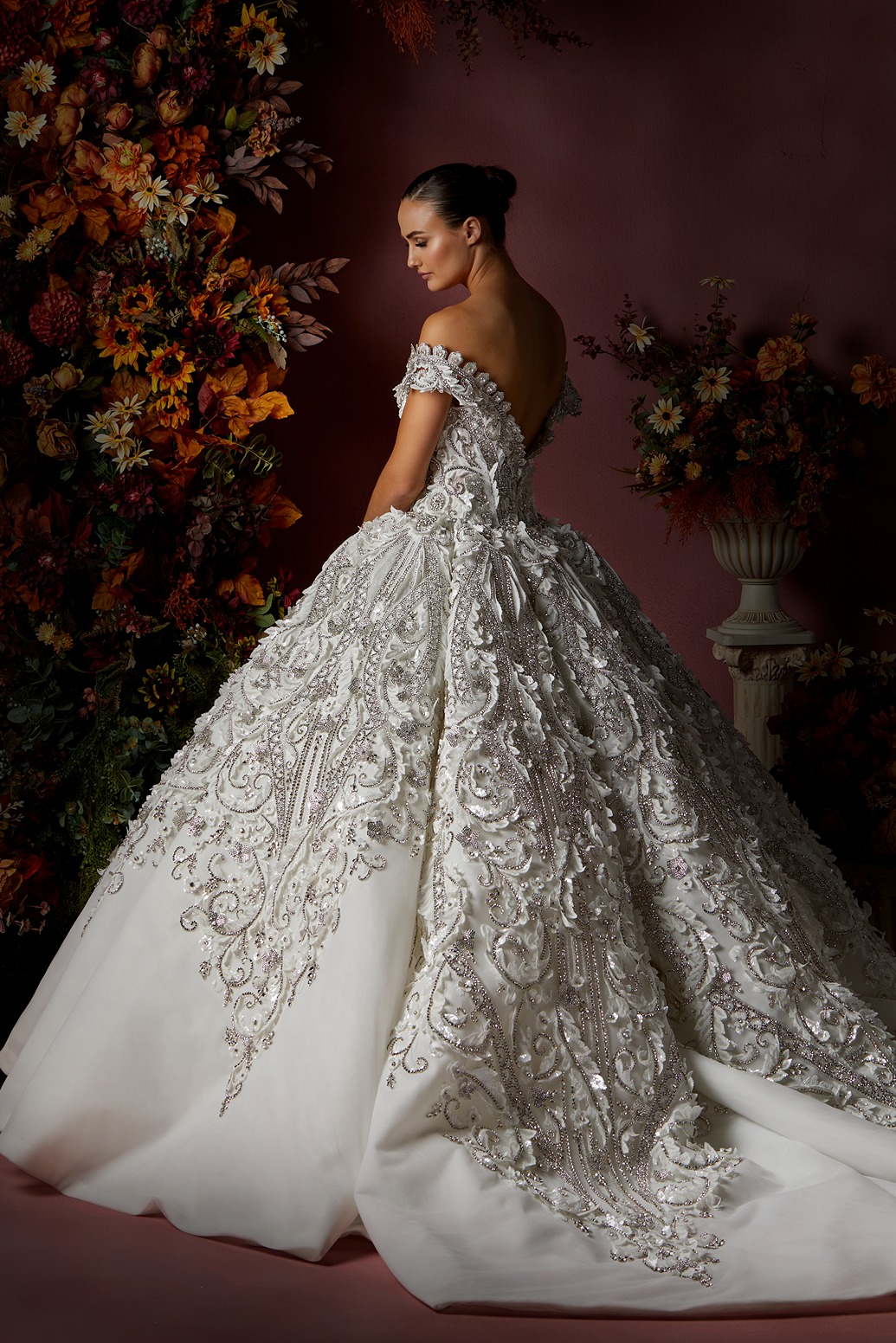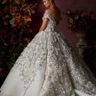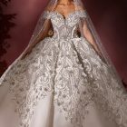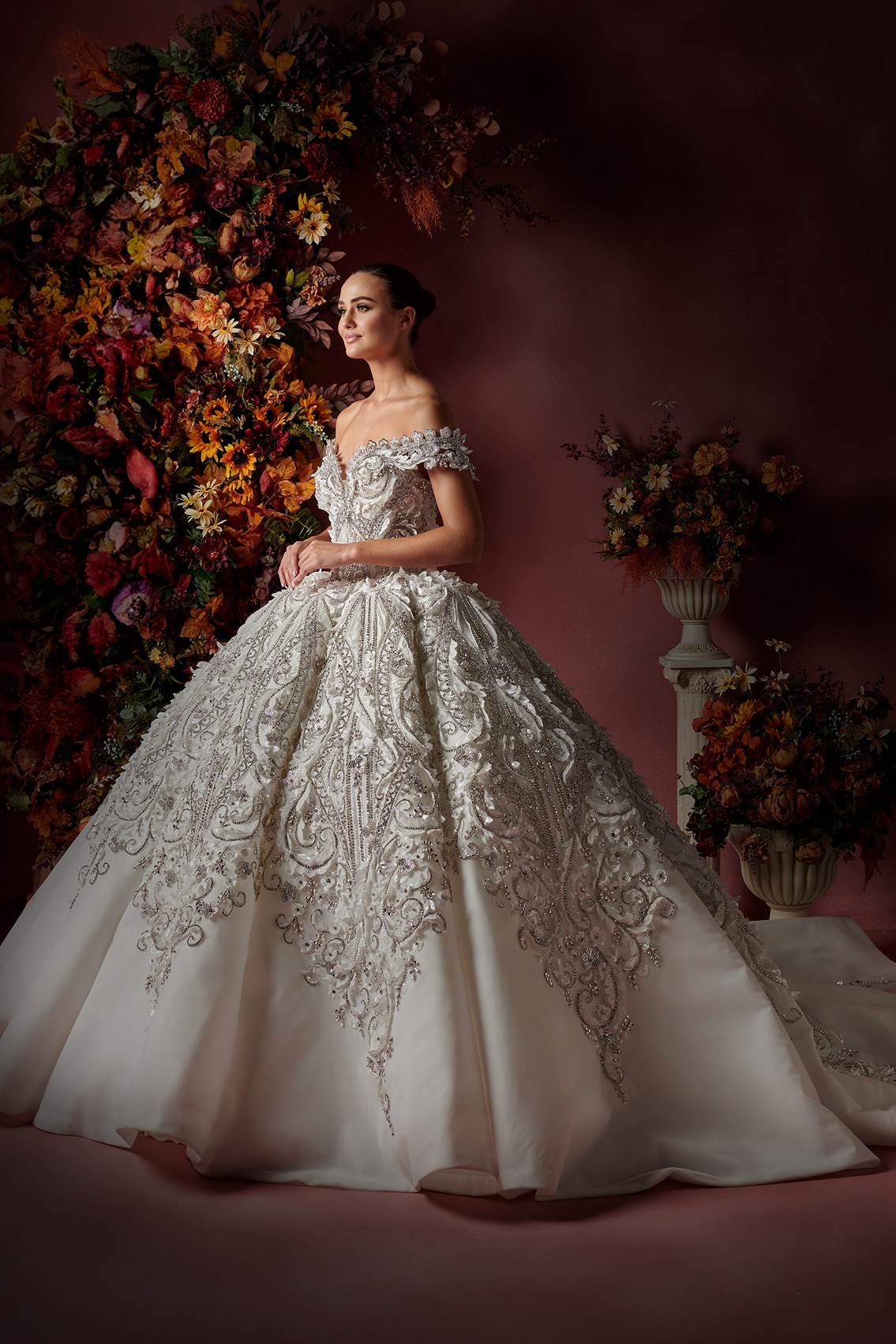 Style: Ball gown Category: Wedding dress Details: Off Shoulder Panel Ball gown encrusted with Swarovski crystals.