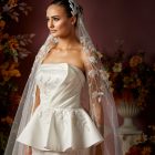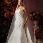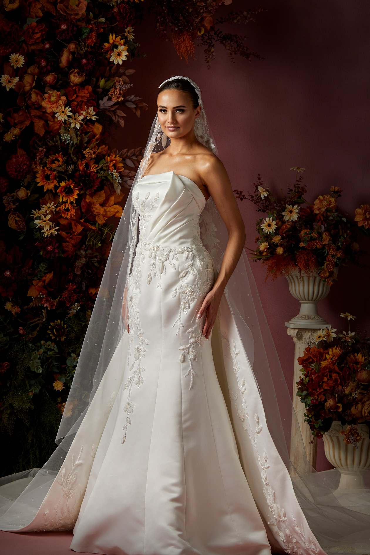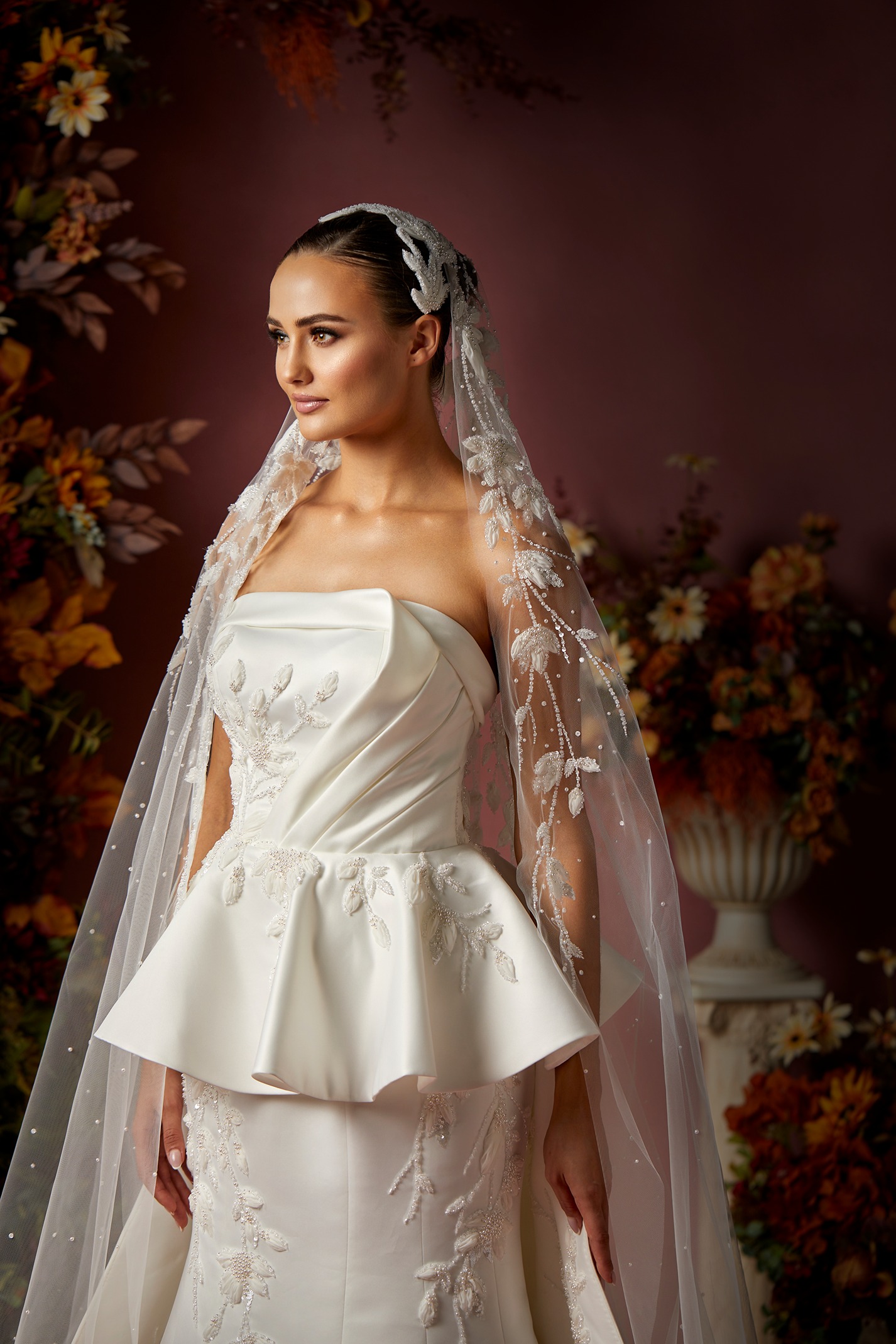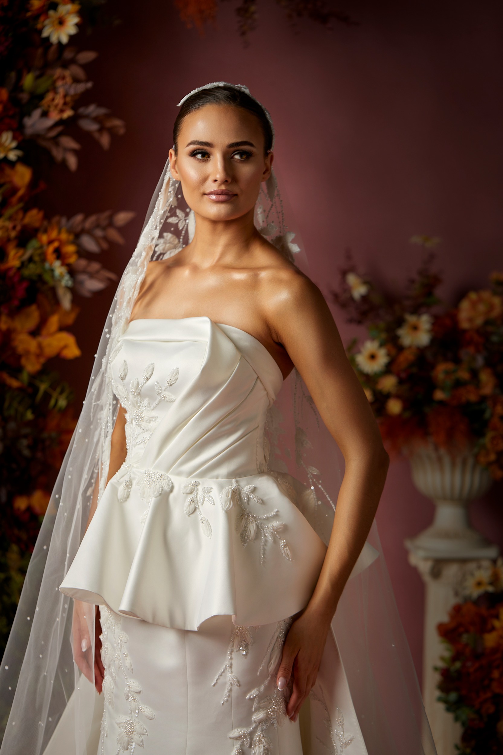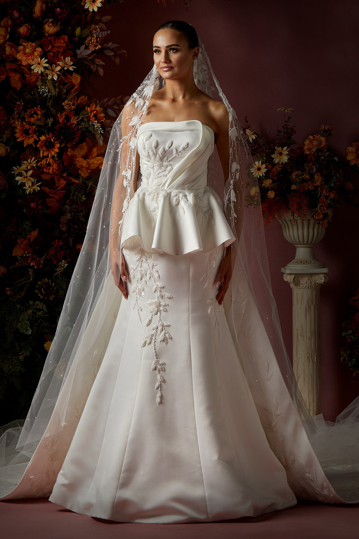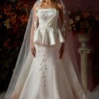 Details: Draped Strapless Satin Trumpet Dress with detachable Peplum Skirt and Embroidered Train.