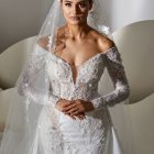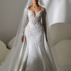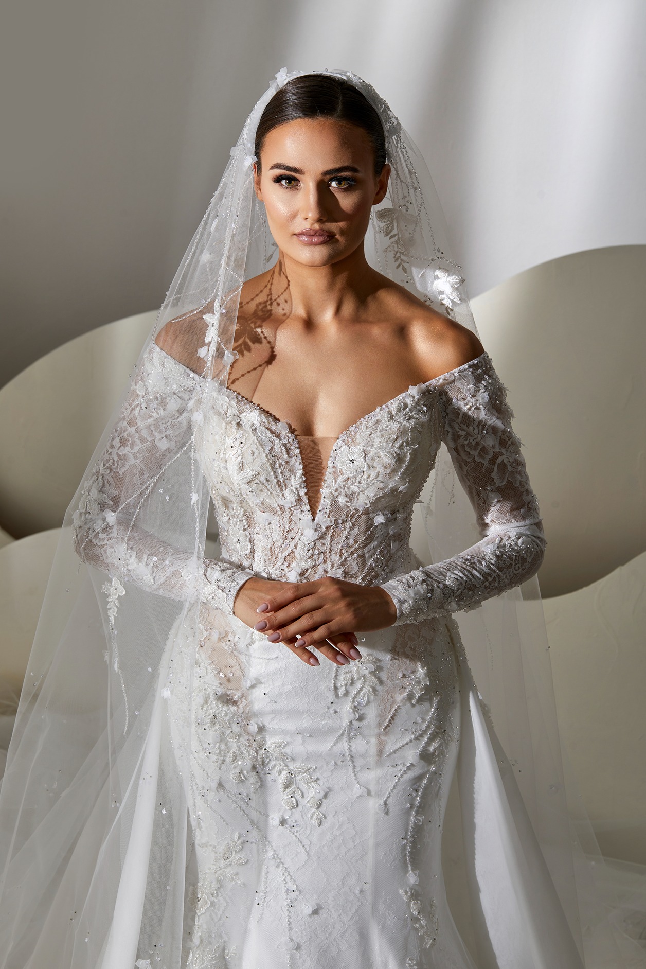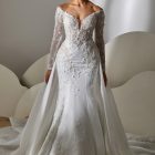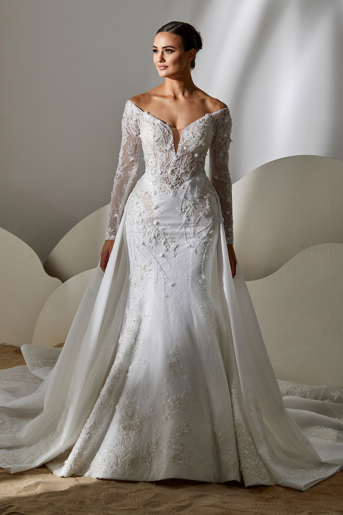 Style: Mermaid Category: Wedding dress Details: Off Shoulder Mermaid dress with overskirt and lace details.