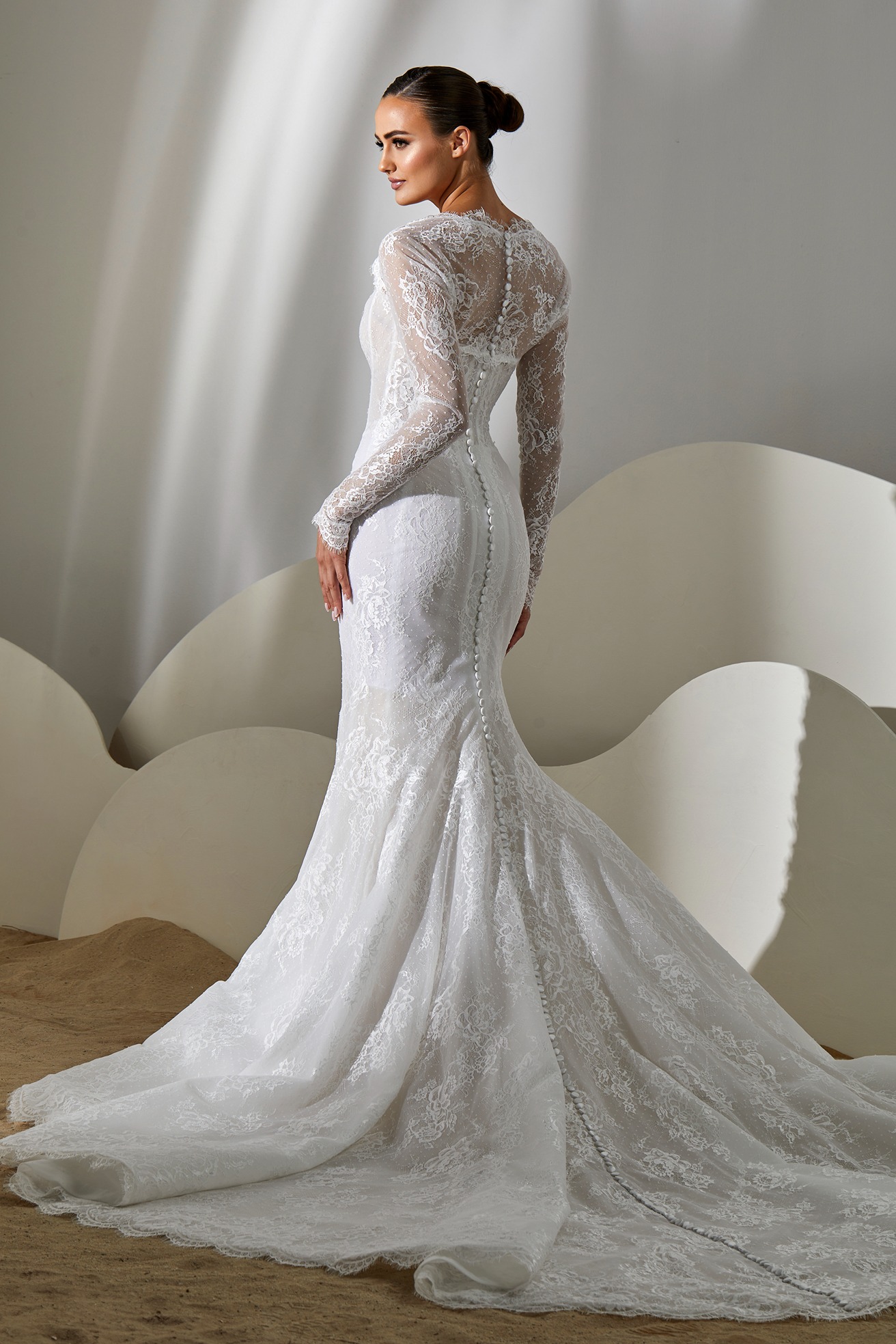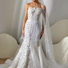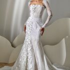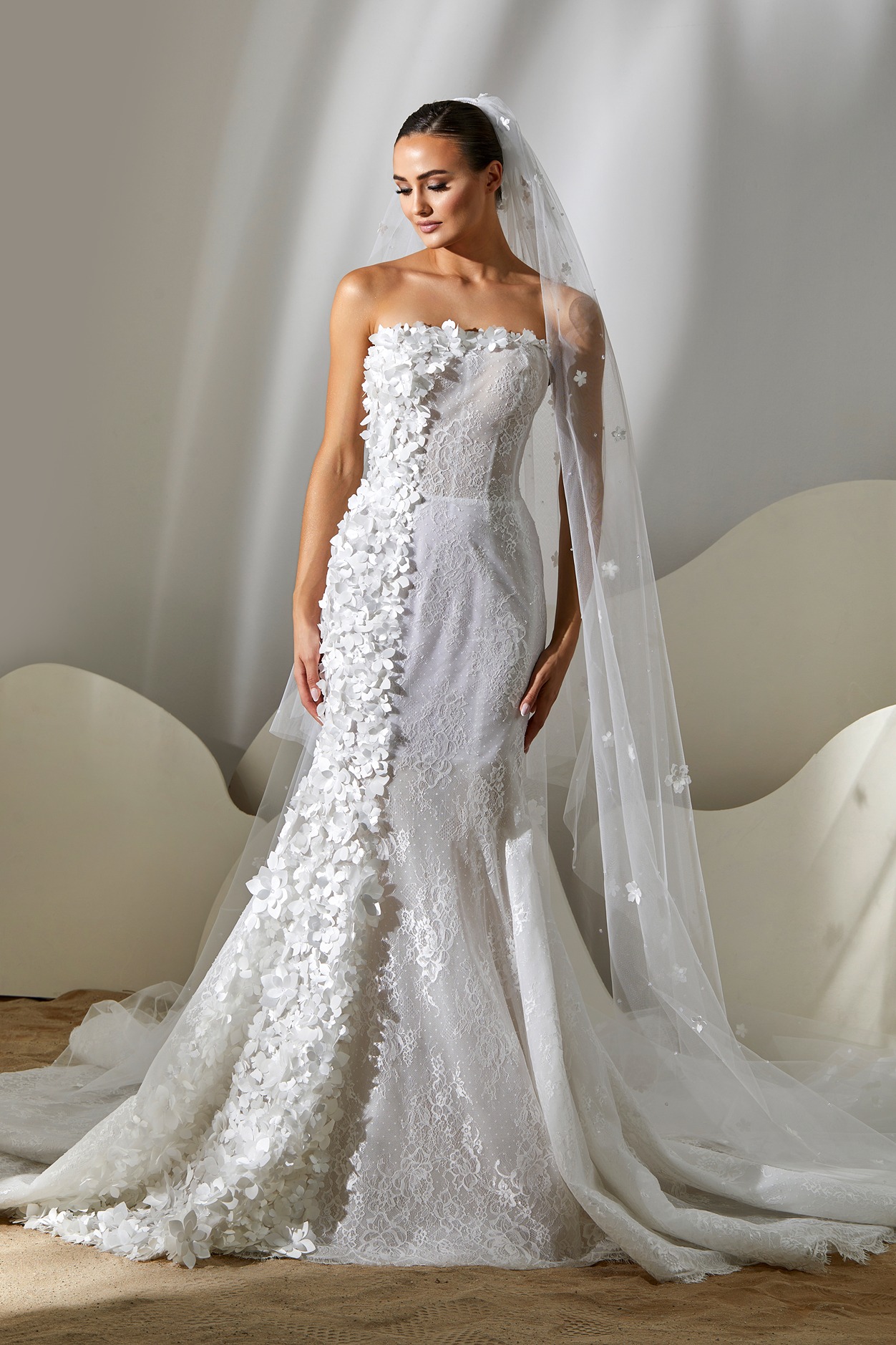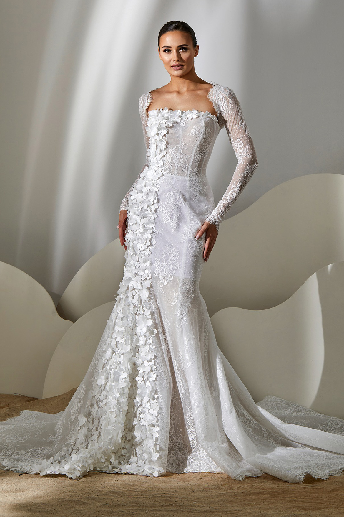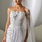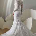 Style: Mermaid Category: Wedding dress Details: Lace fit-and-flare dress with mikado flowers embroidered panel.
