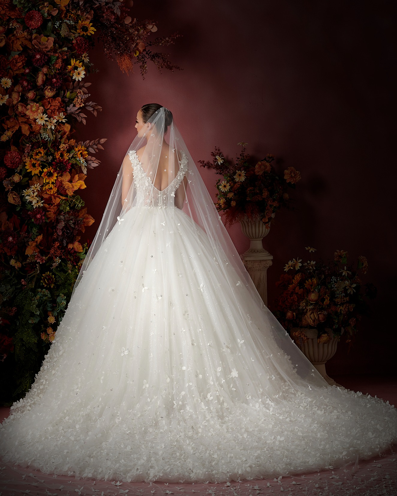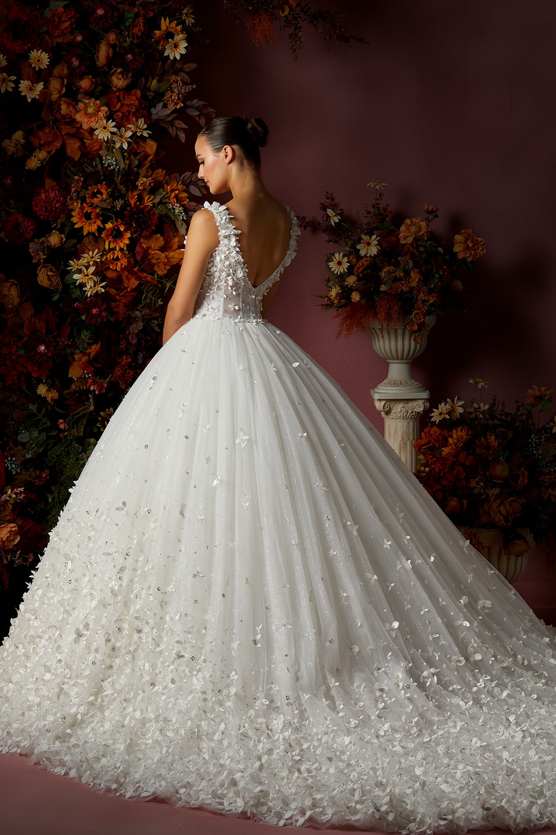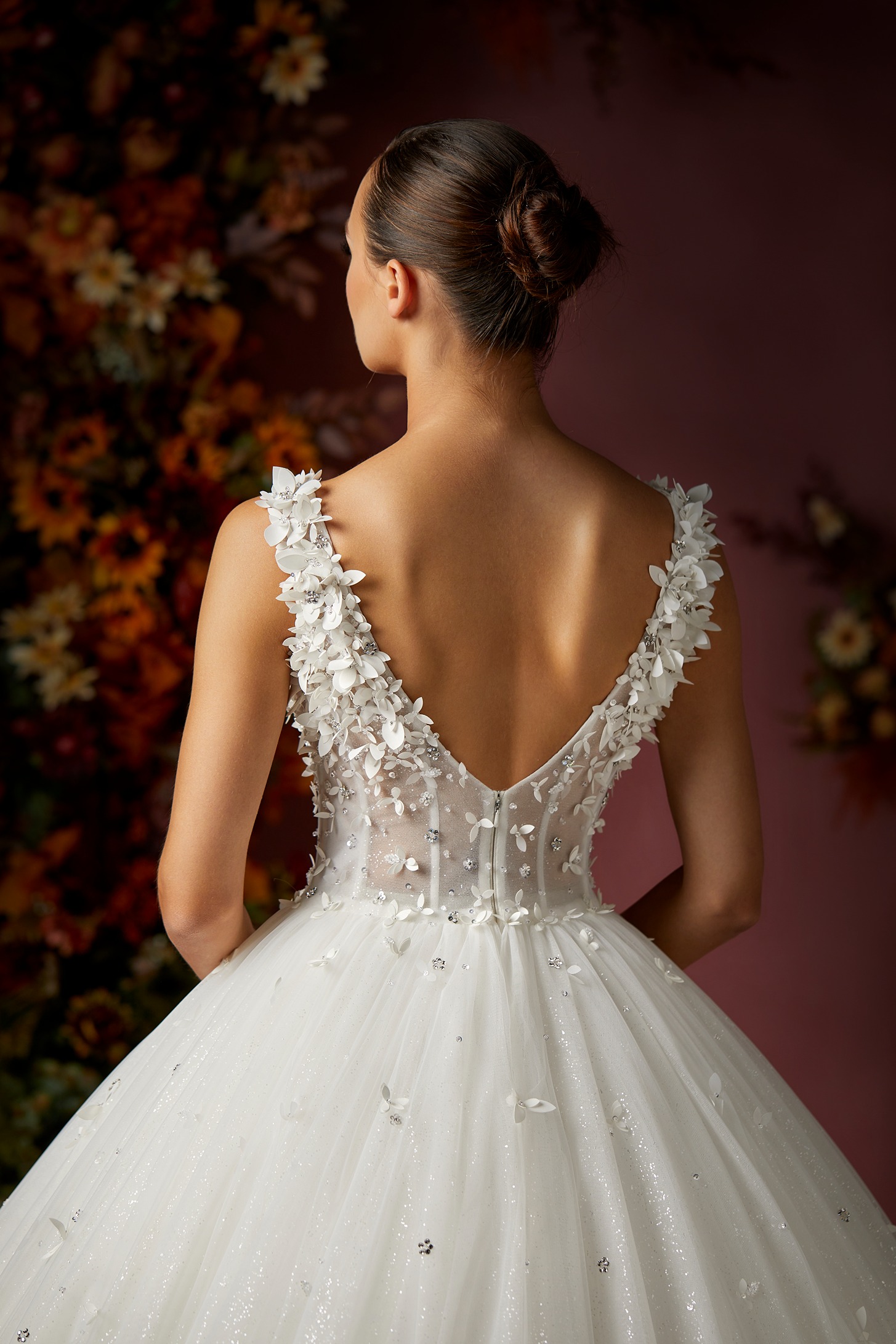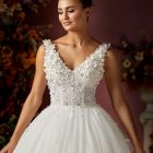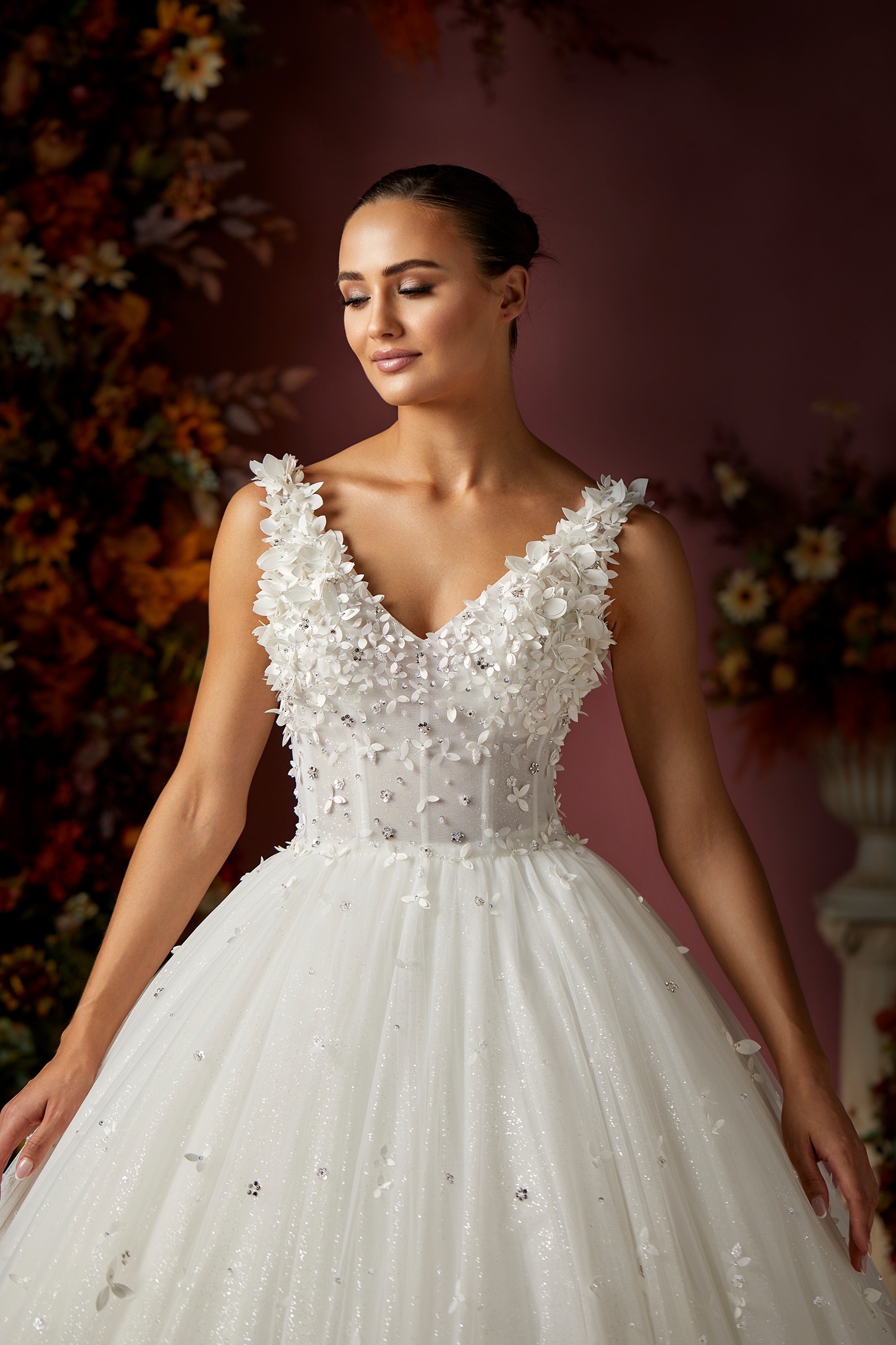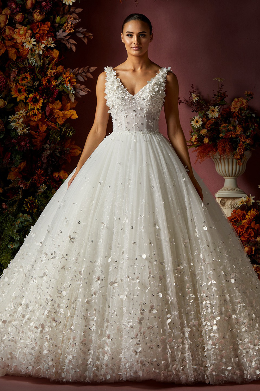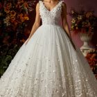 Details: Sleeveless V-Neckline Tulle ball gown with Flower and beads embellishment.