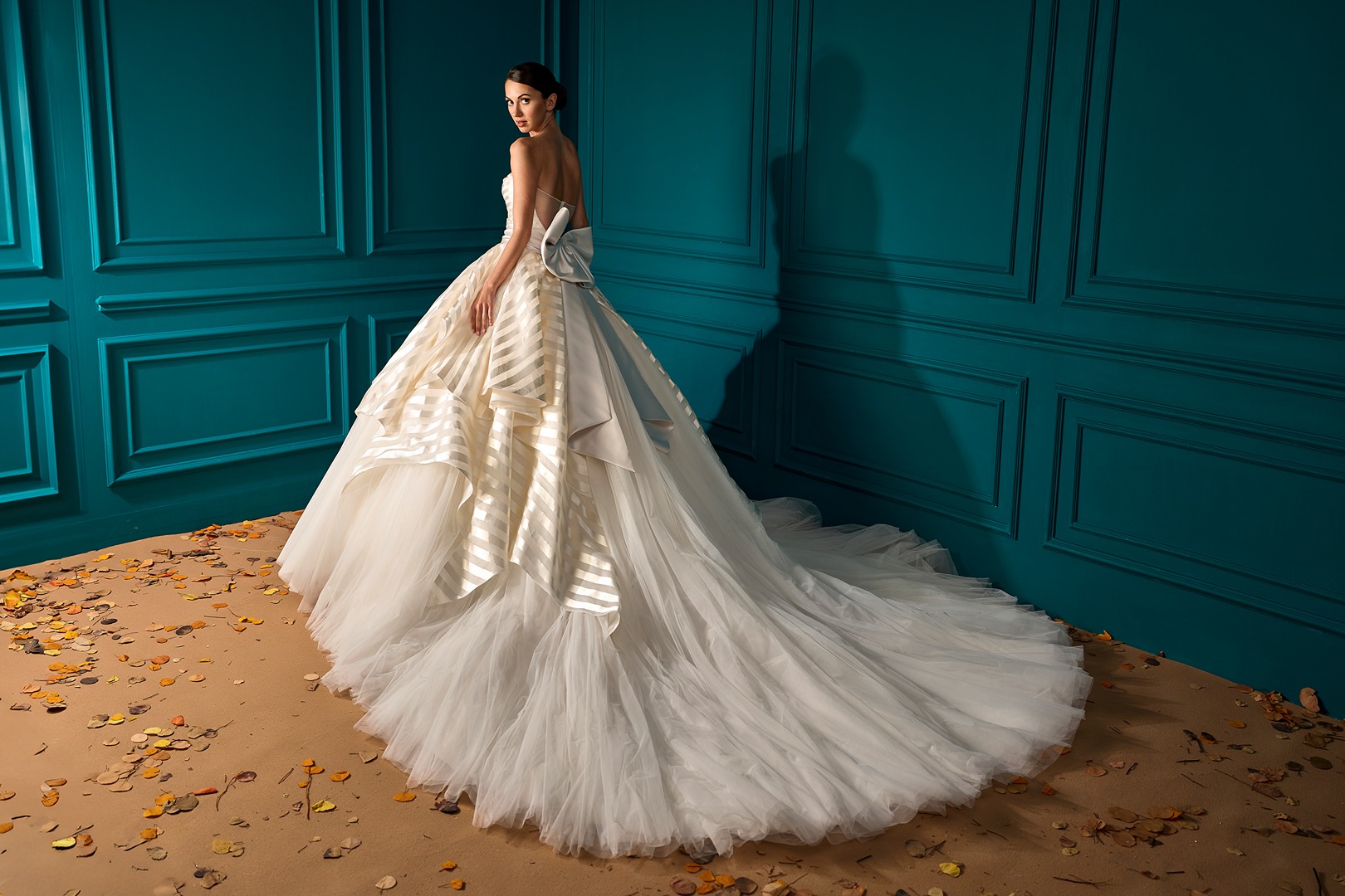Details: Strapless Tulle Ball Gown with Printed Silk and Bow Over Lay.