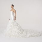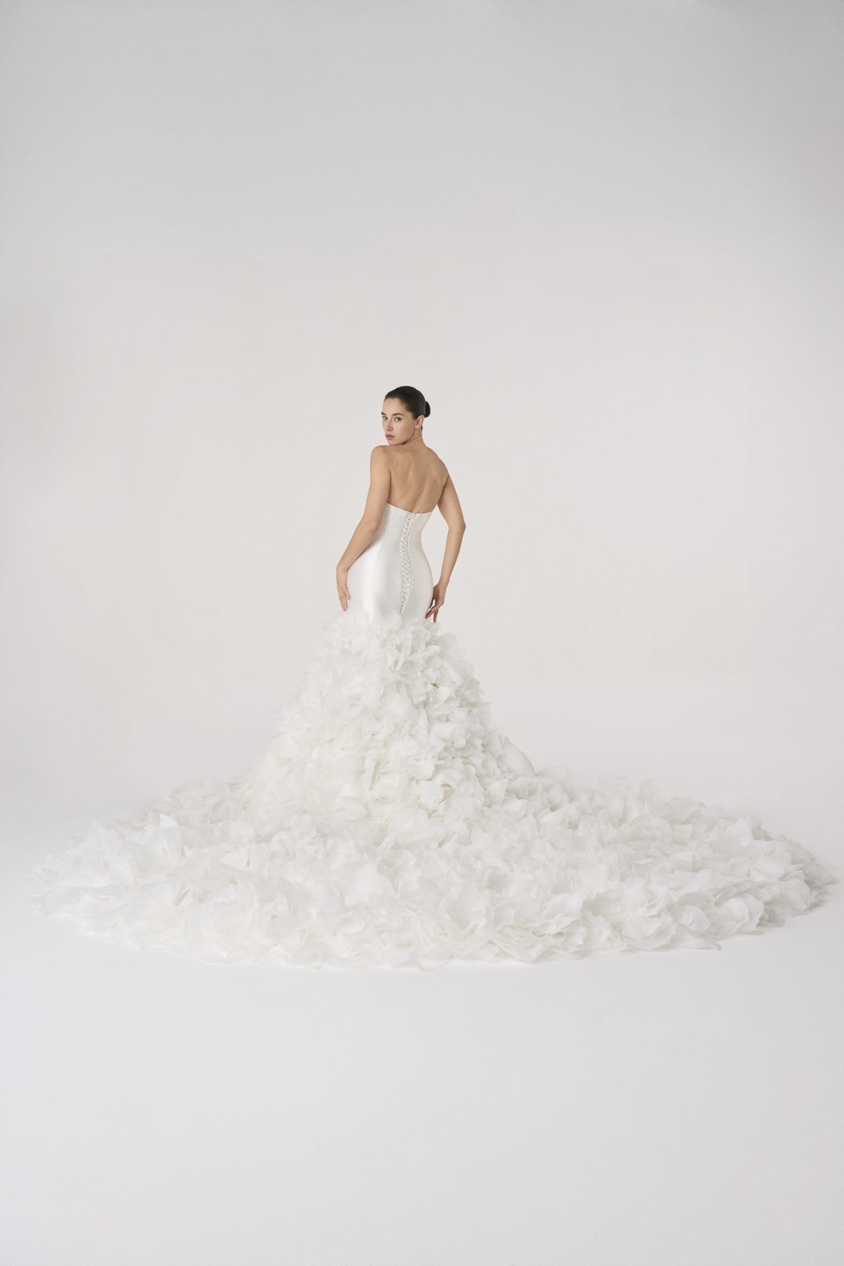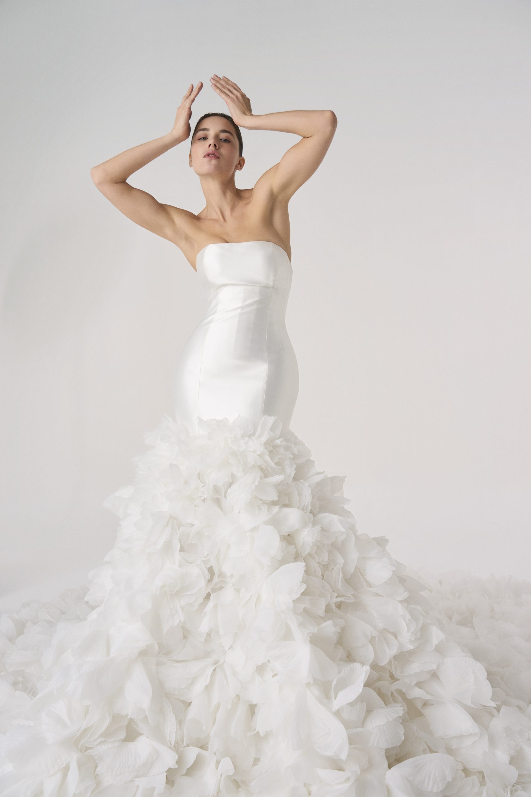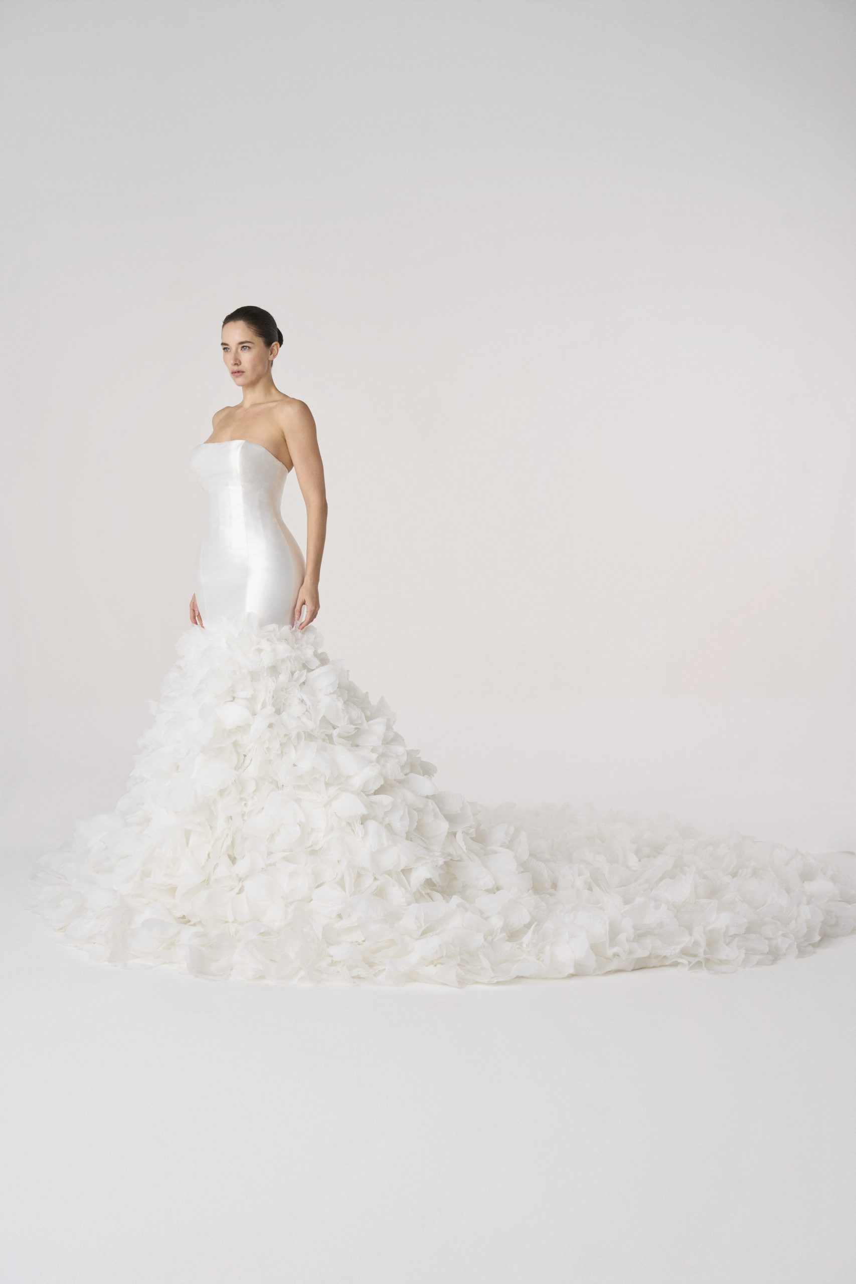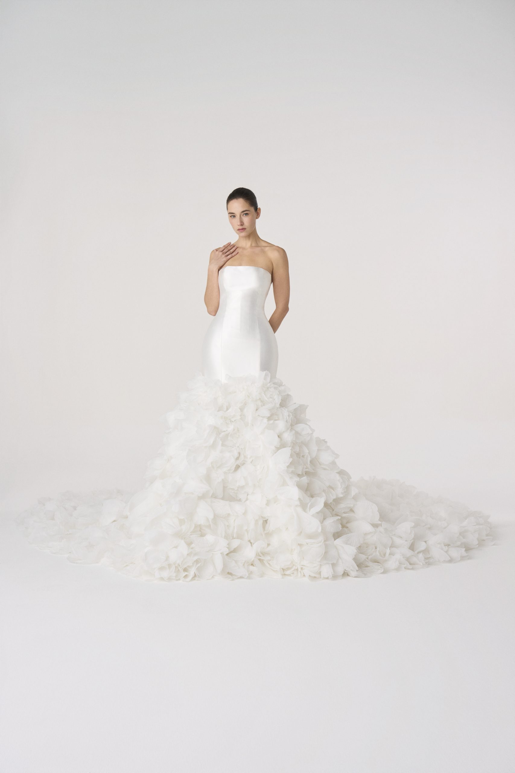 A vision suspended in descent — as if a thousand petals had chosen to fall at once and never touch the ground. The bodice is pure restraint, sculpted in satin like a vessel of stillness, before it surrenders into a cascade of gathered bloom.