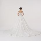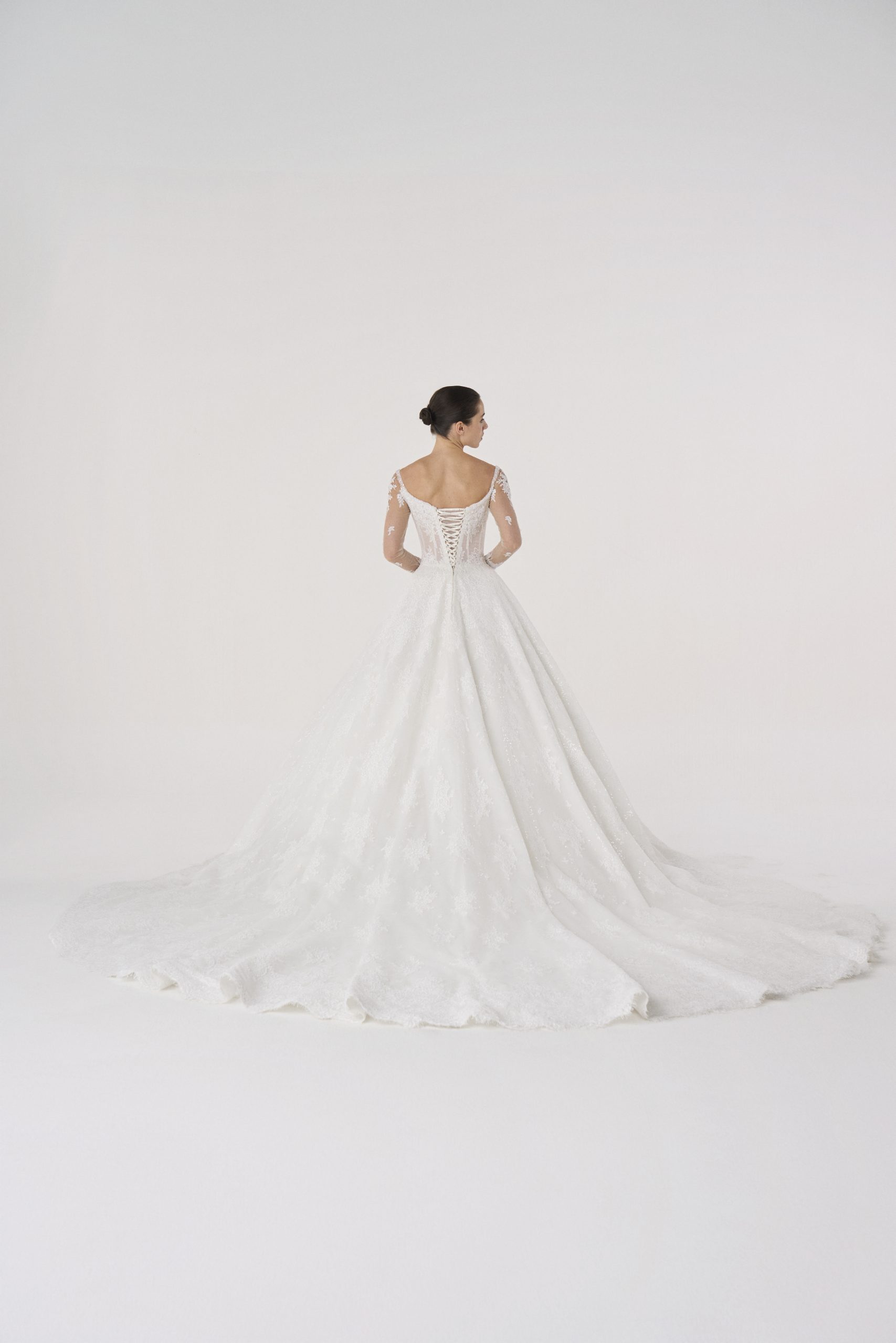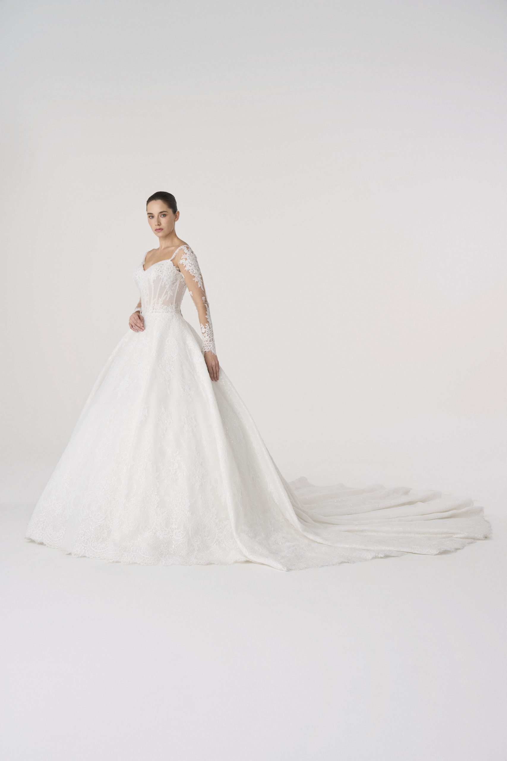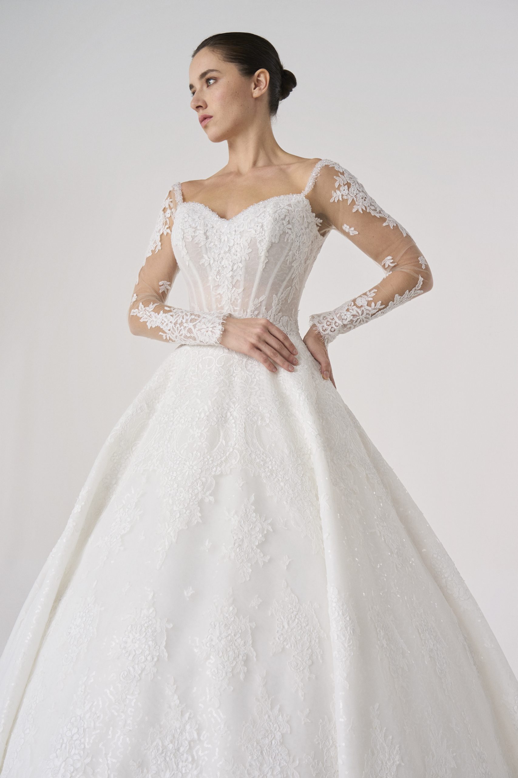 The lace sleeves extend like an aura, fragile in detail yet unshakable in stance. Its bodice holds the body with sculptural resolve,  while the skirt flows outward in quiet authority.