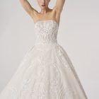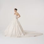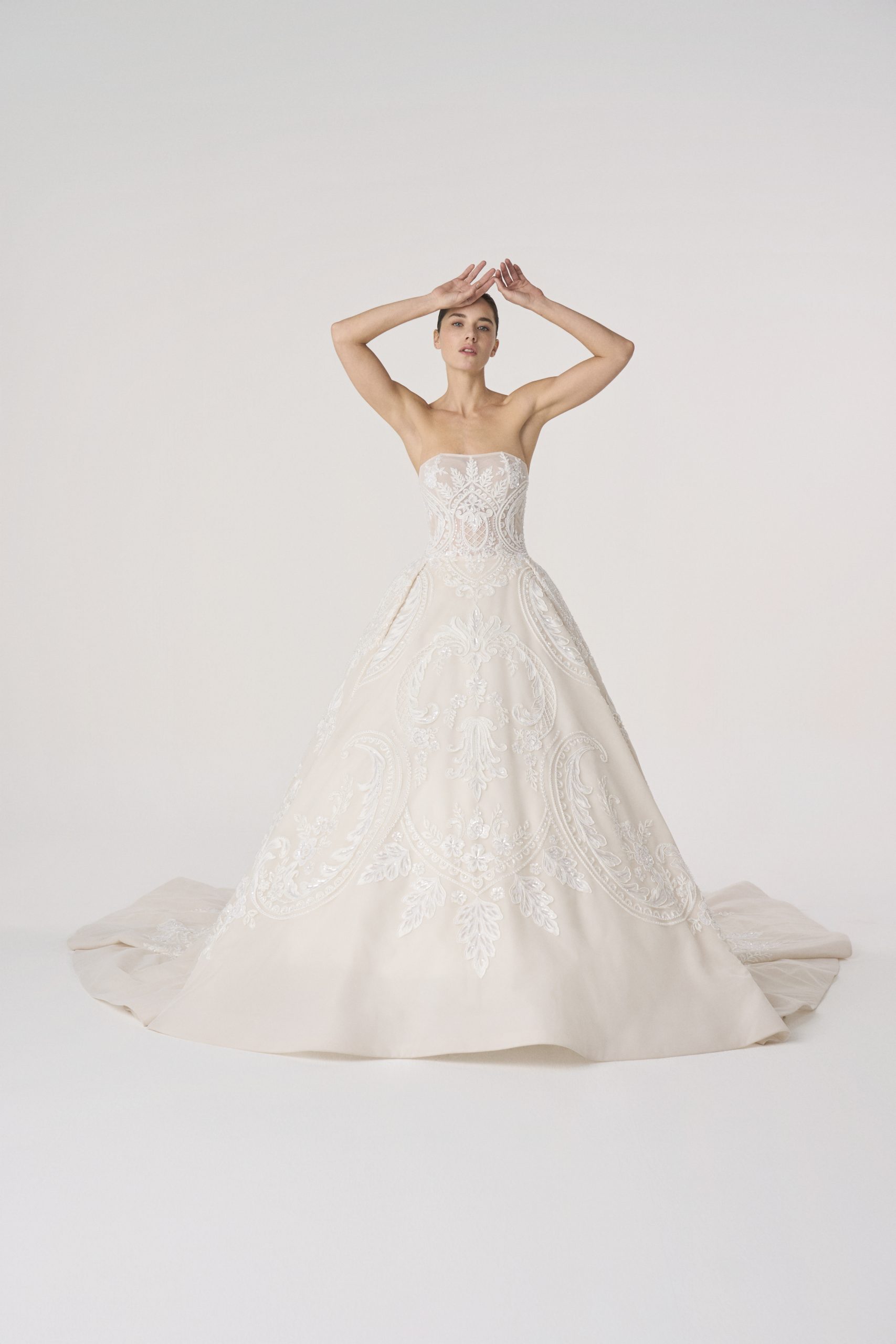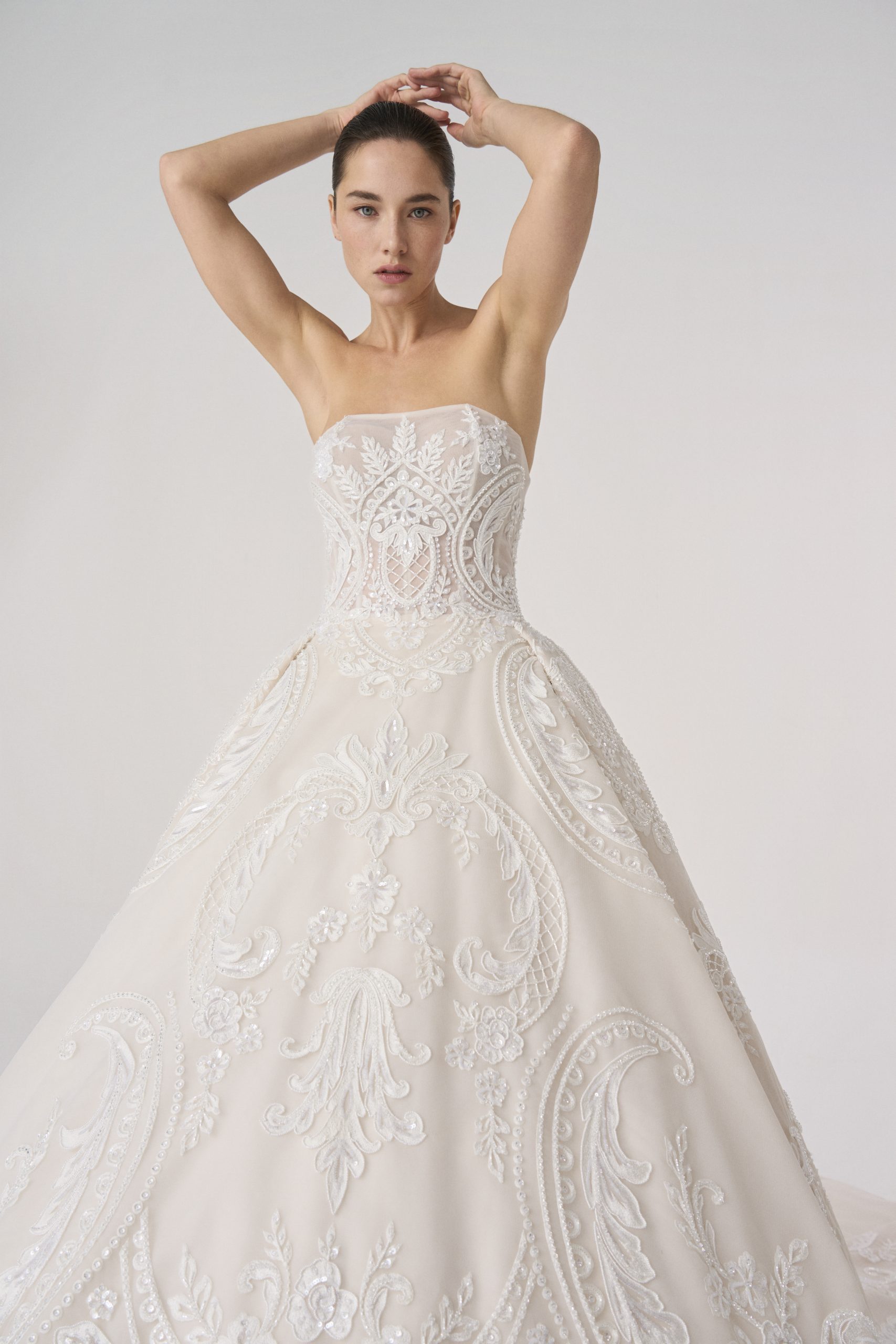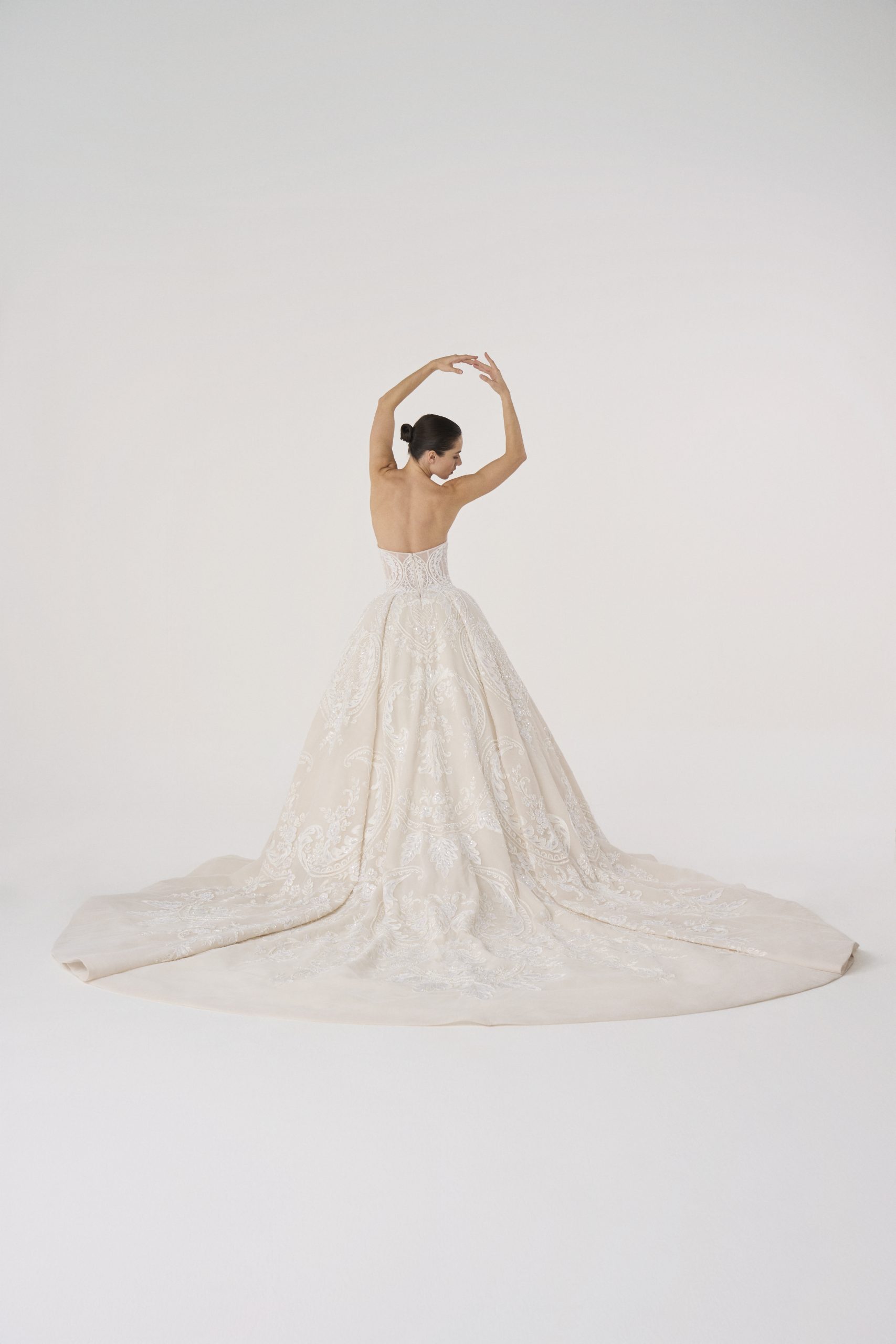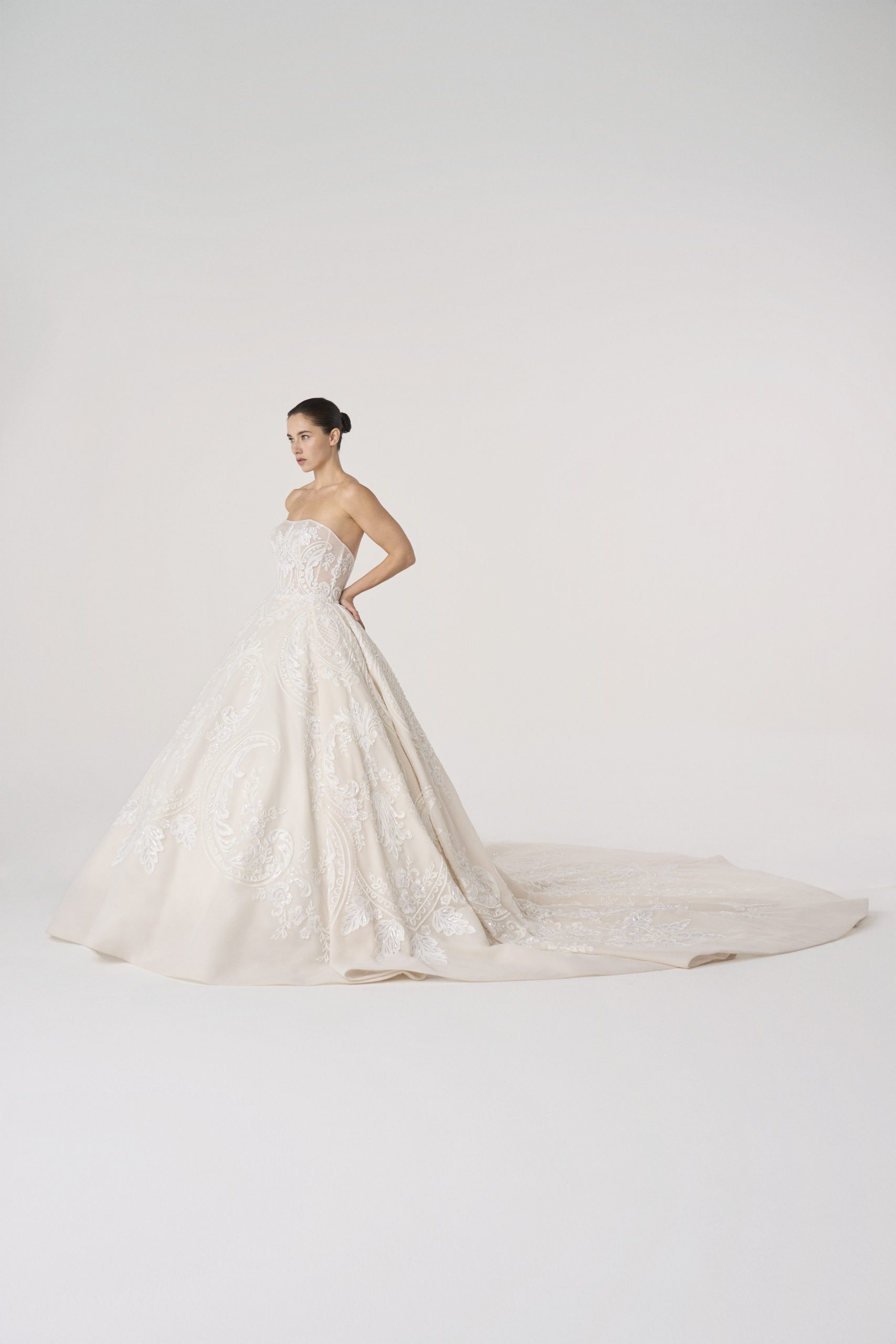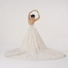 A gown that carries the quiet persistence of an echo — lines etched into fabric as if memory itself had left its mark.