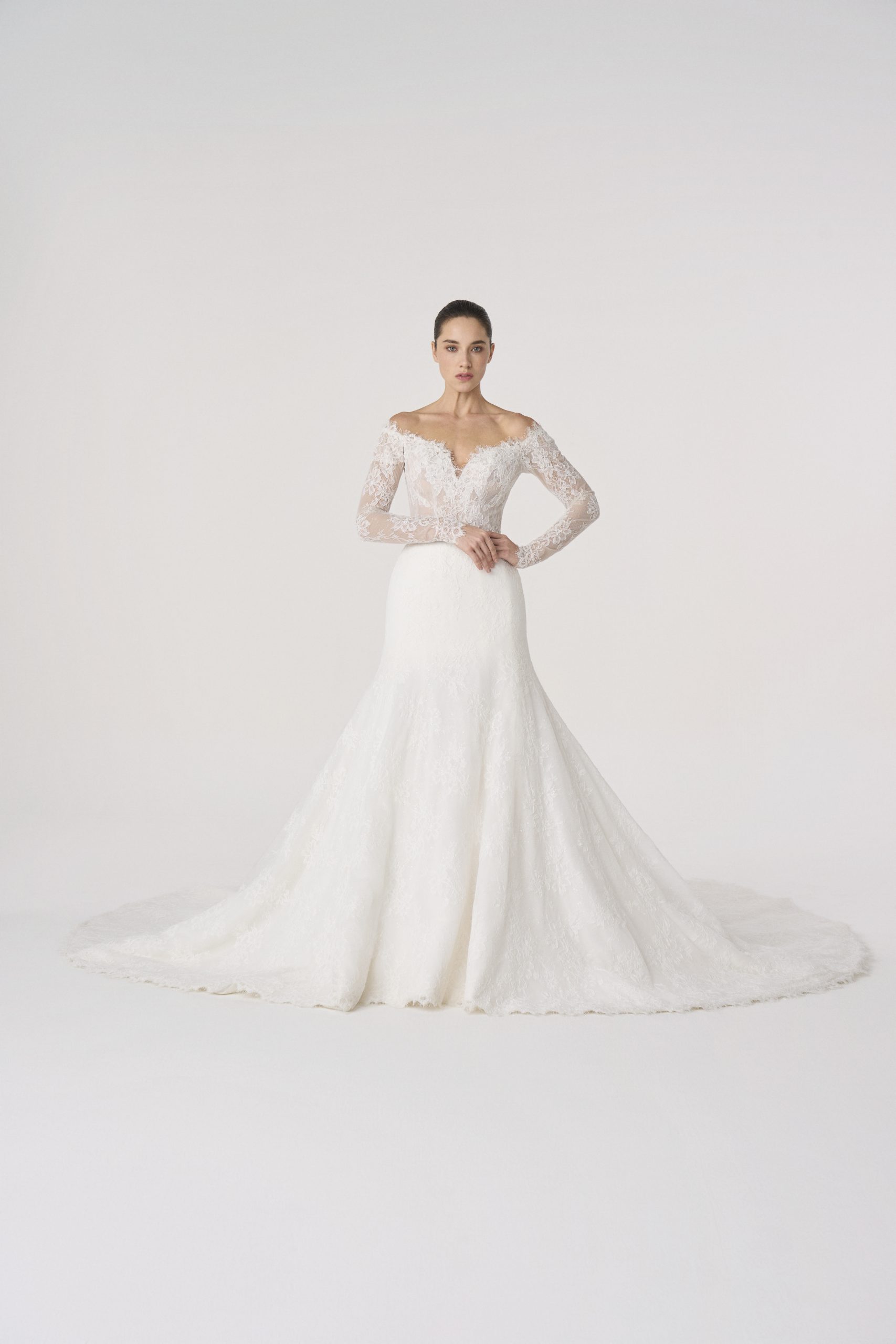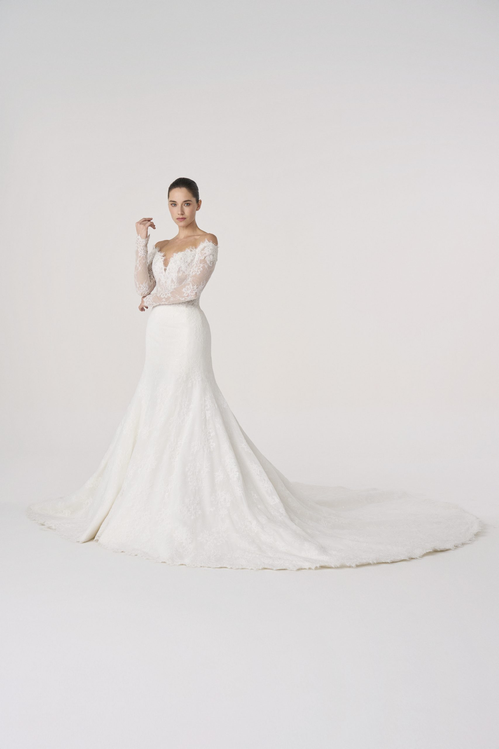 Lace sleeves extend as though carved from light, grounding the silhouette in quiet strength.