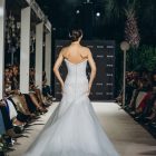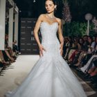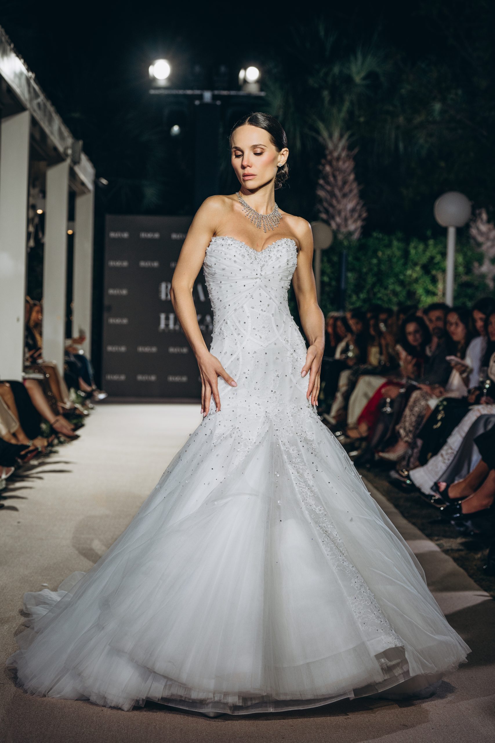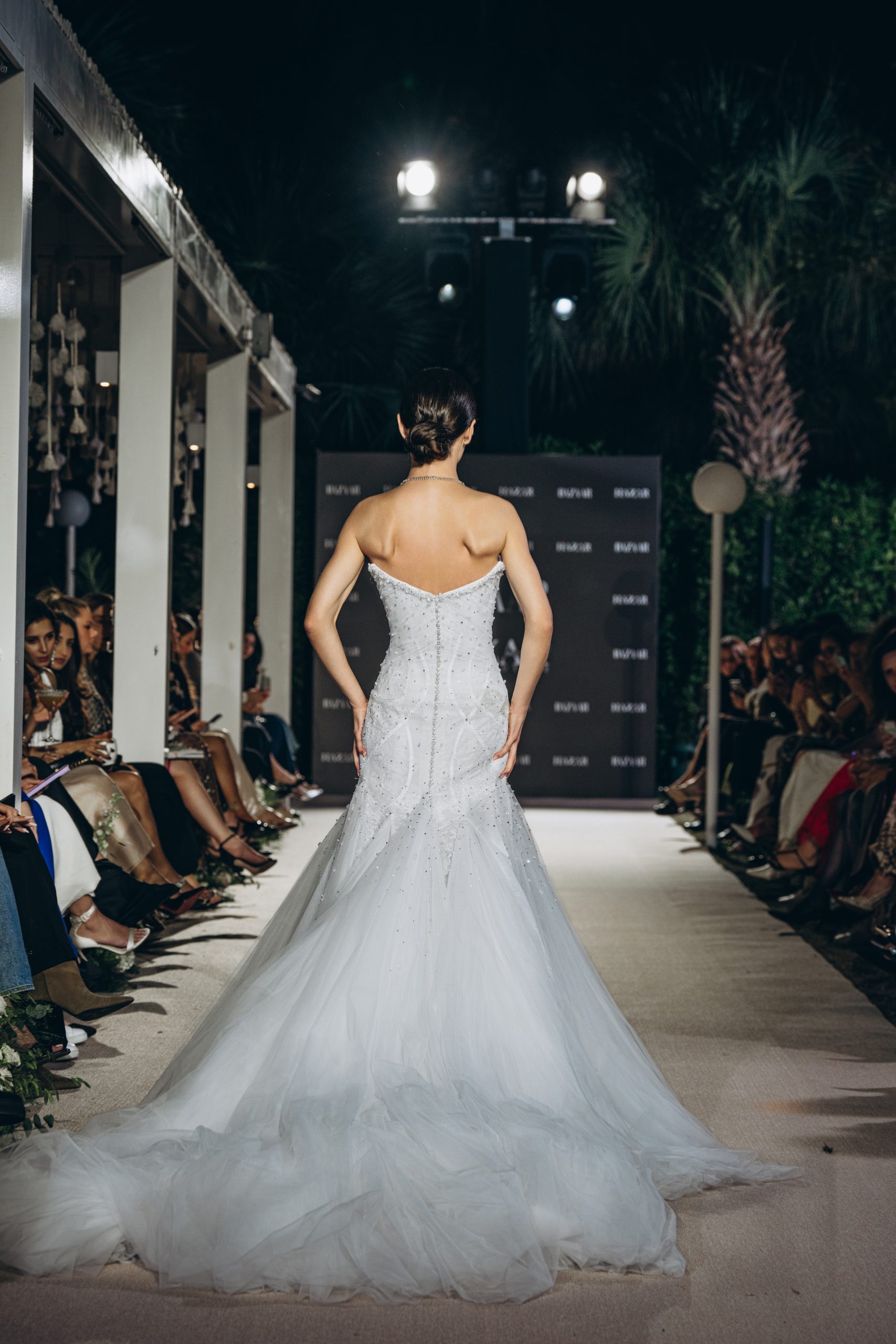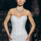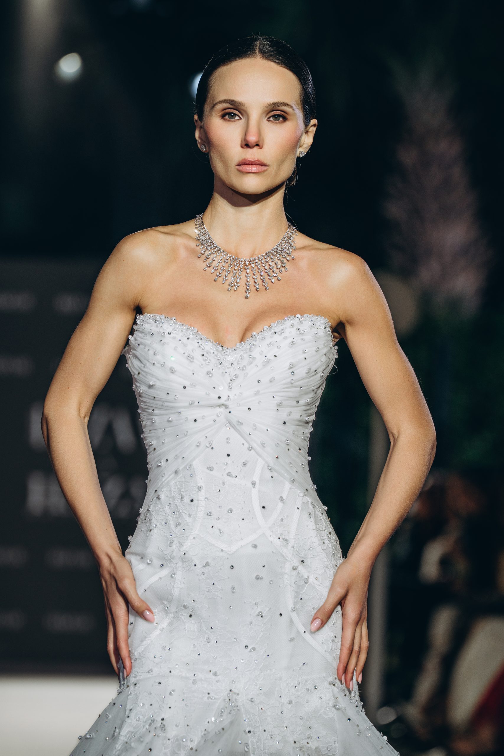 A strapless bodice holds the form with quiet certainty, dissolving seamlessly into a fitted sheath. Lace emerges gradually, thinning and reappearing across the surface, allowing the body to remain visible beneath its pattern.