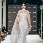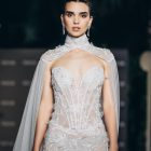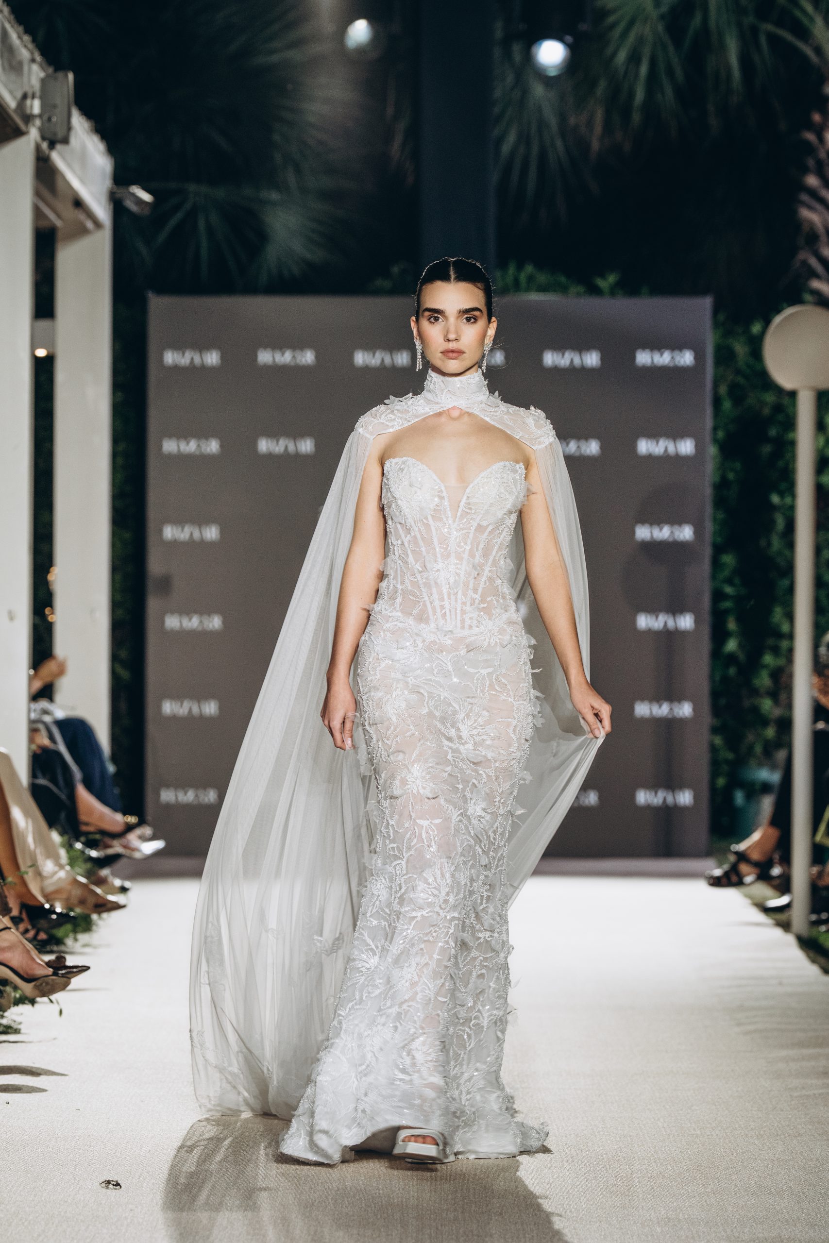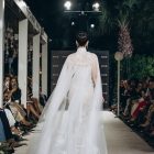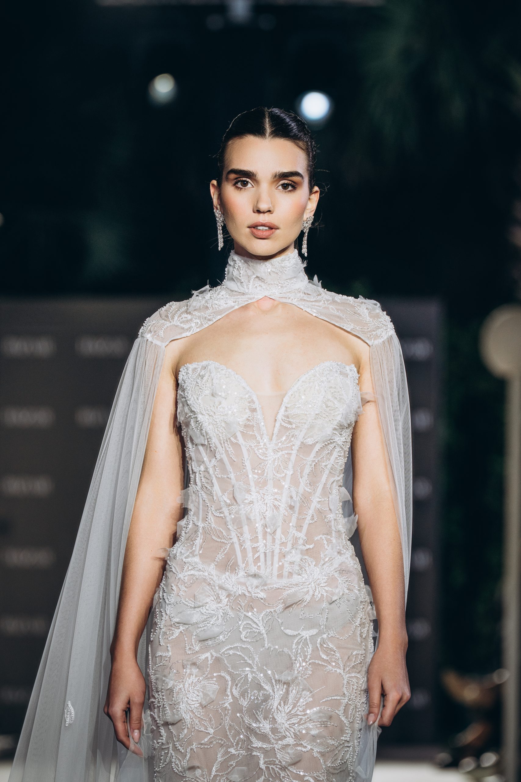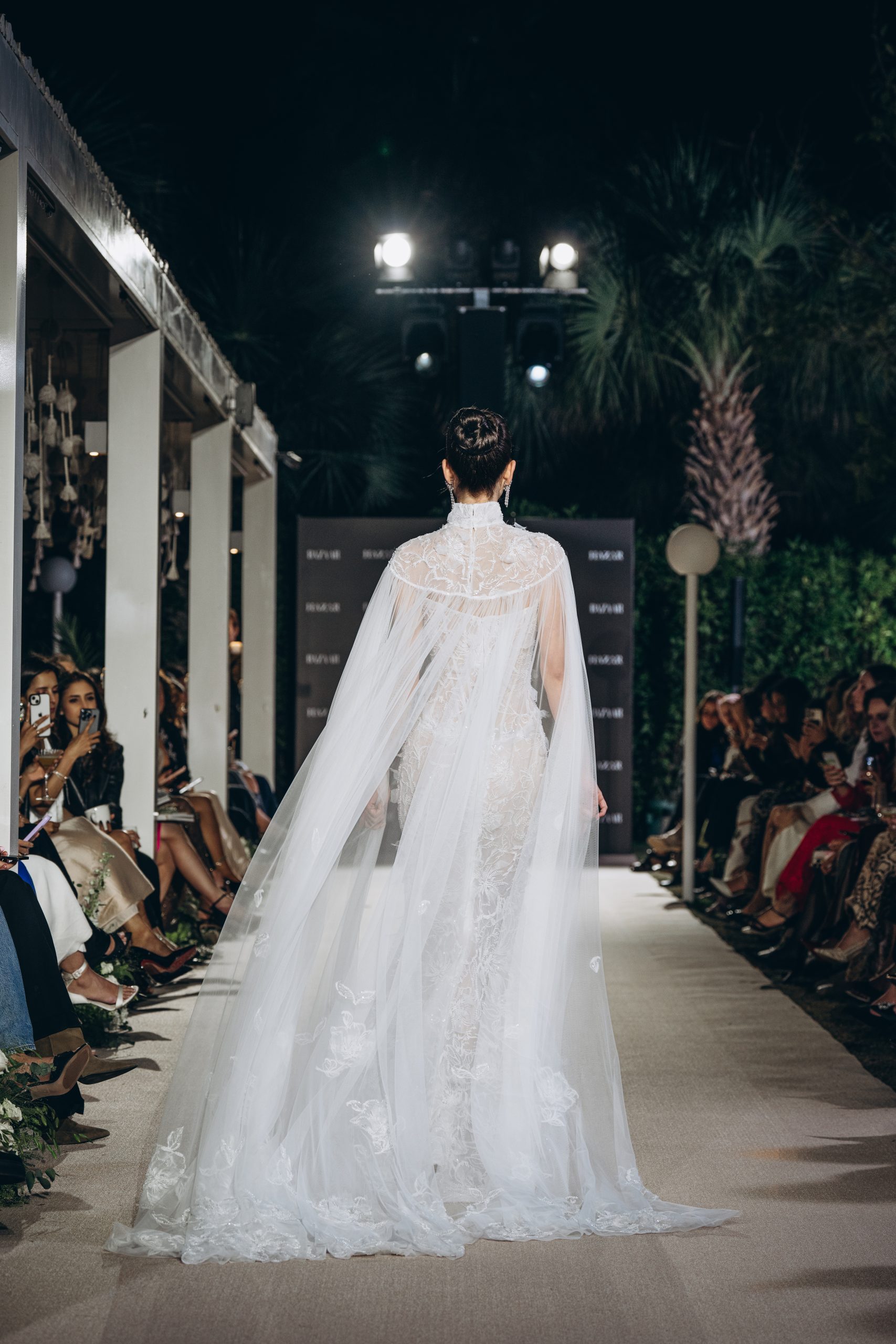 A field of florals organized into silhouette, where lace establishes both movement and containment. The cape emerges as a quiet extension of this landscape — weightless, elongated, and deliberate.