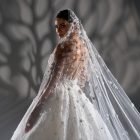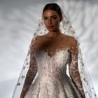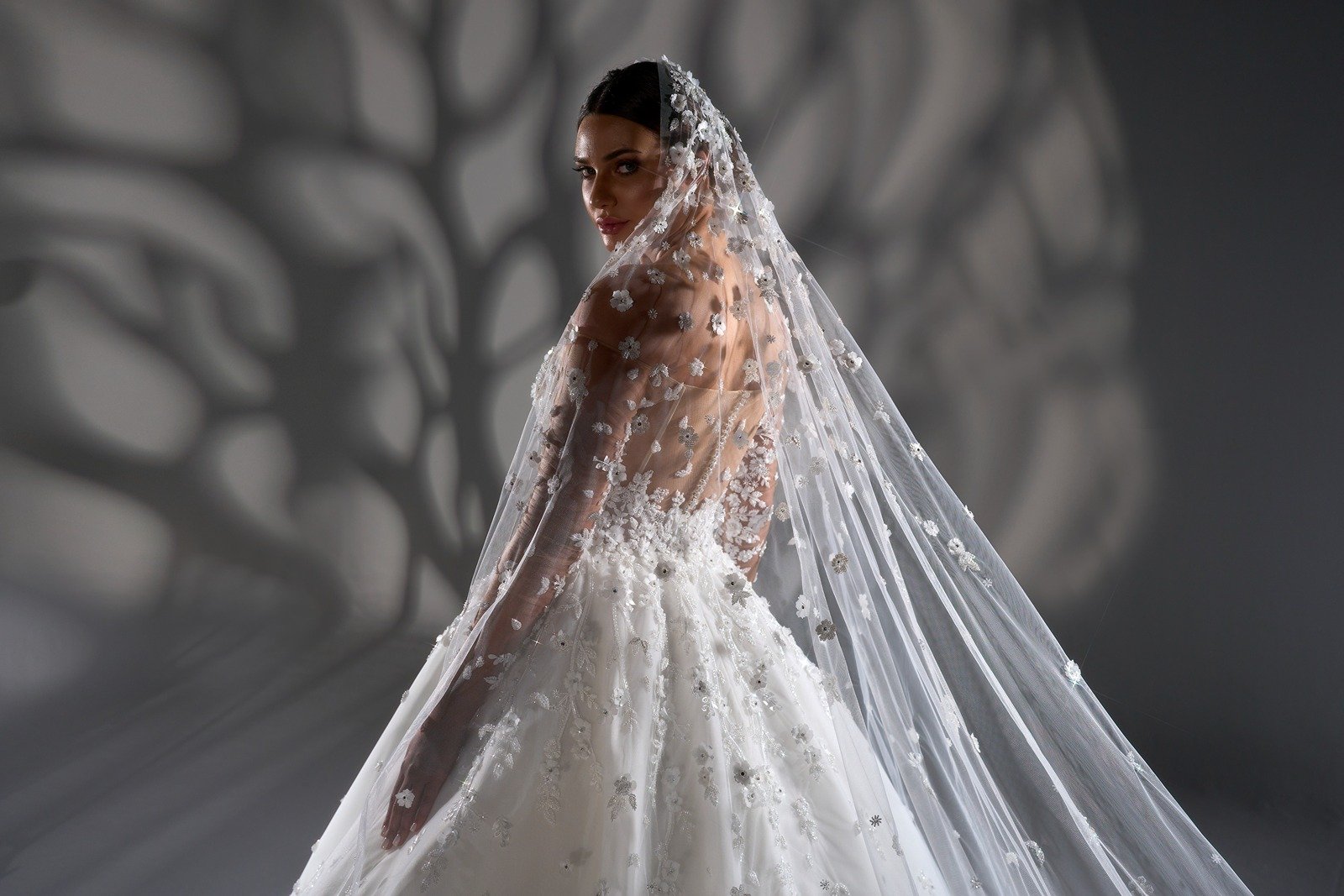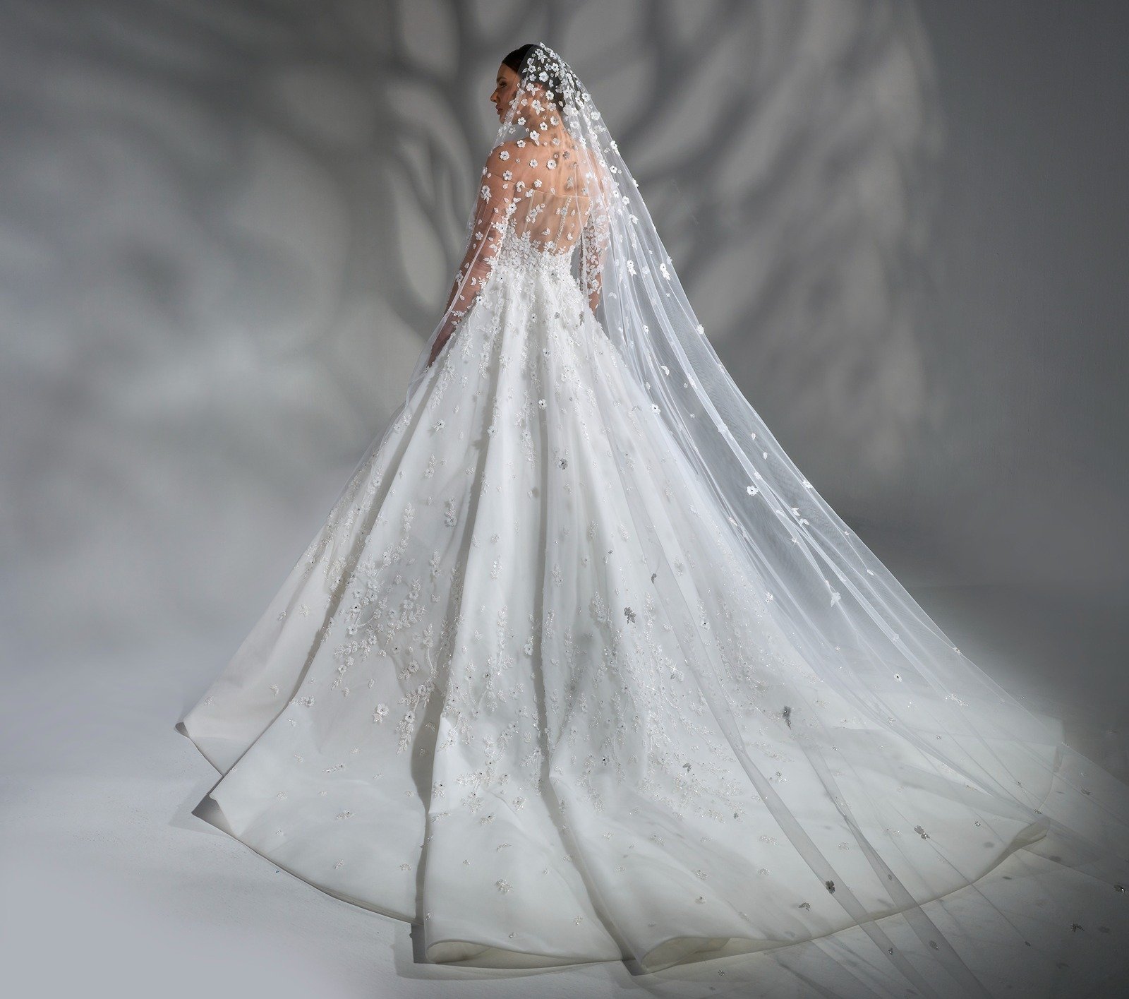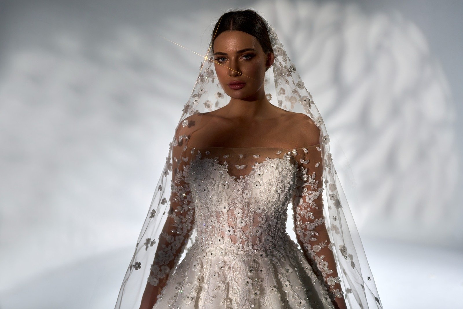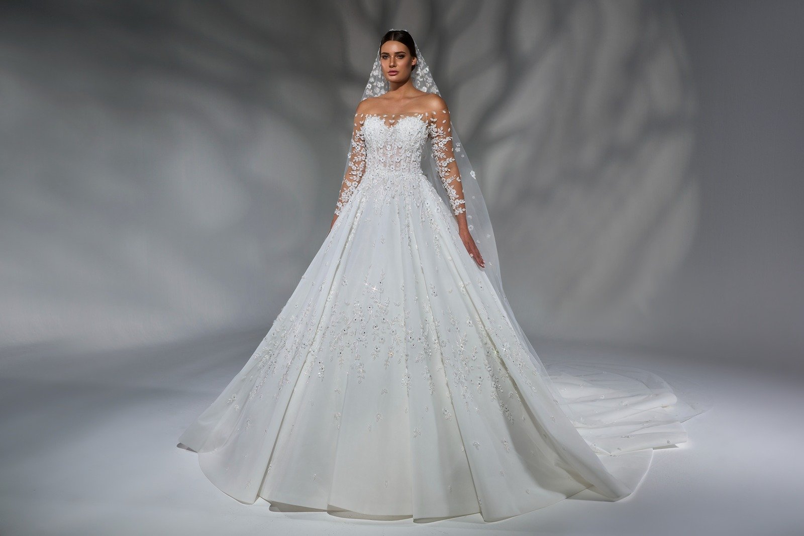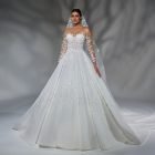 Details: Embroidered Tulle Ball Gown with Illusion Neckline and Long Sleeves.