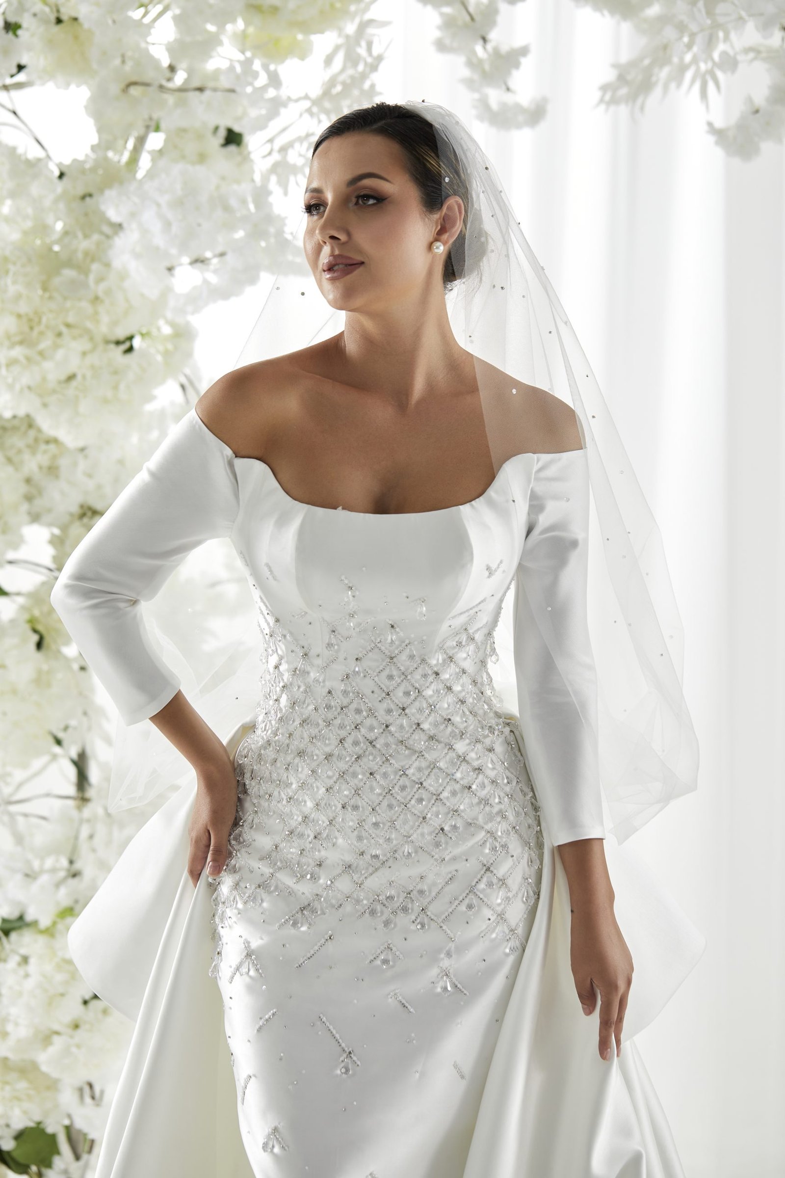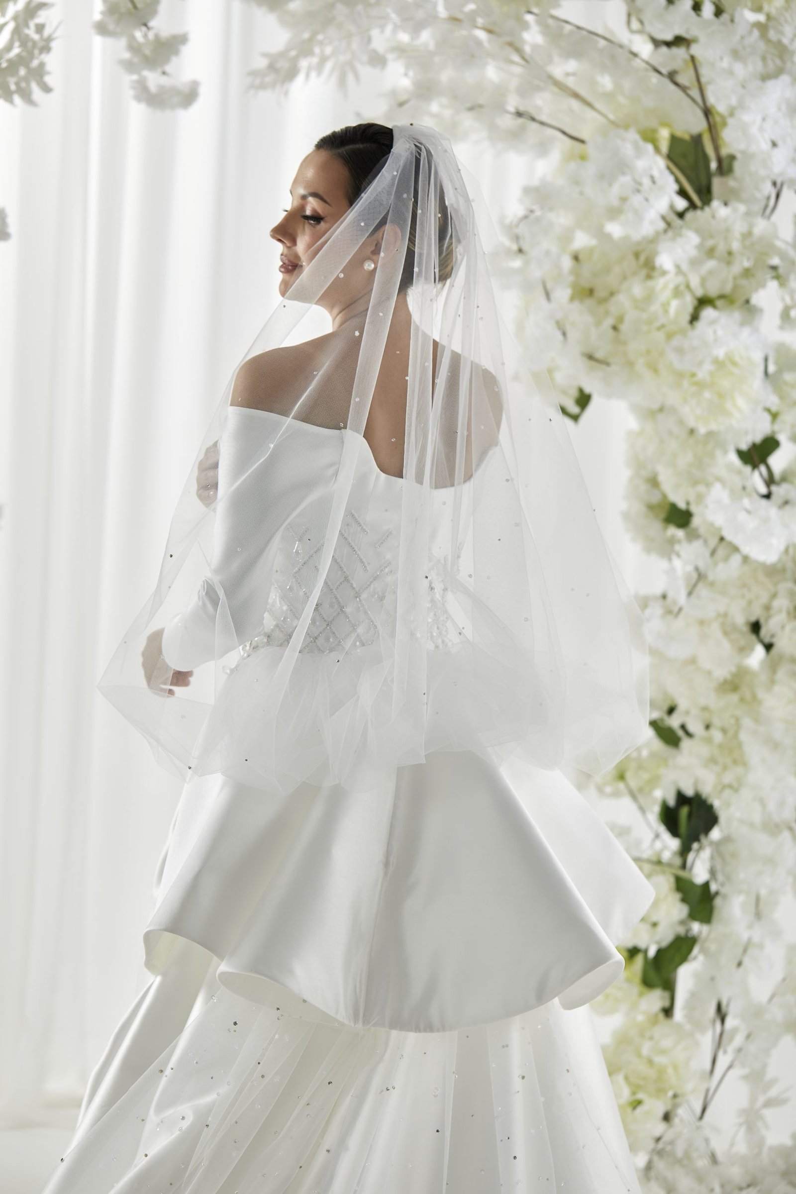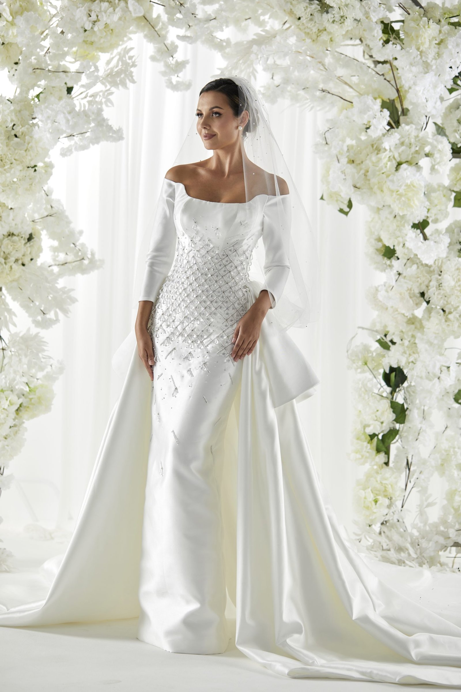 Details: Crystallized Mikado Dress with Structured Over Skirt and Tulle Overlay
